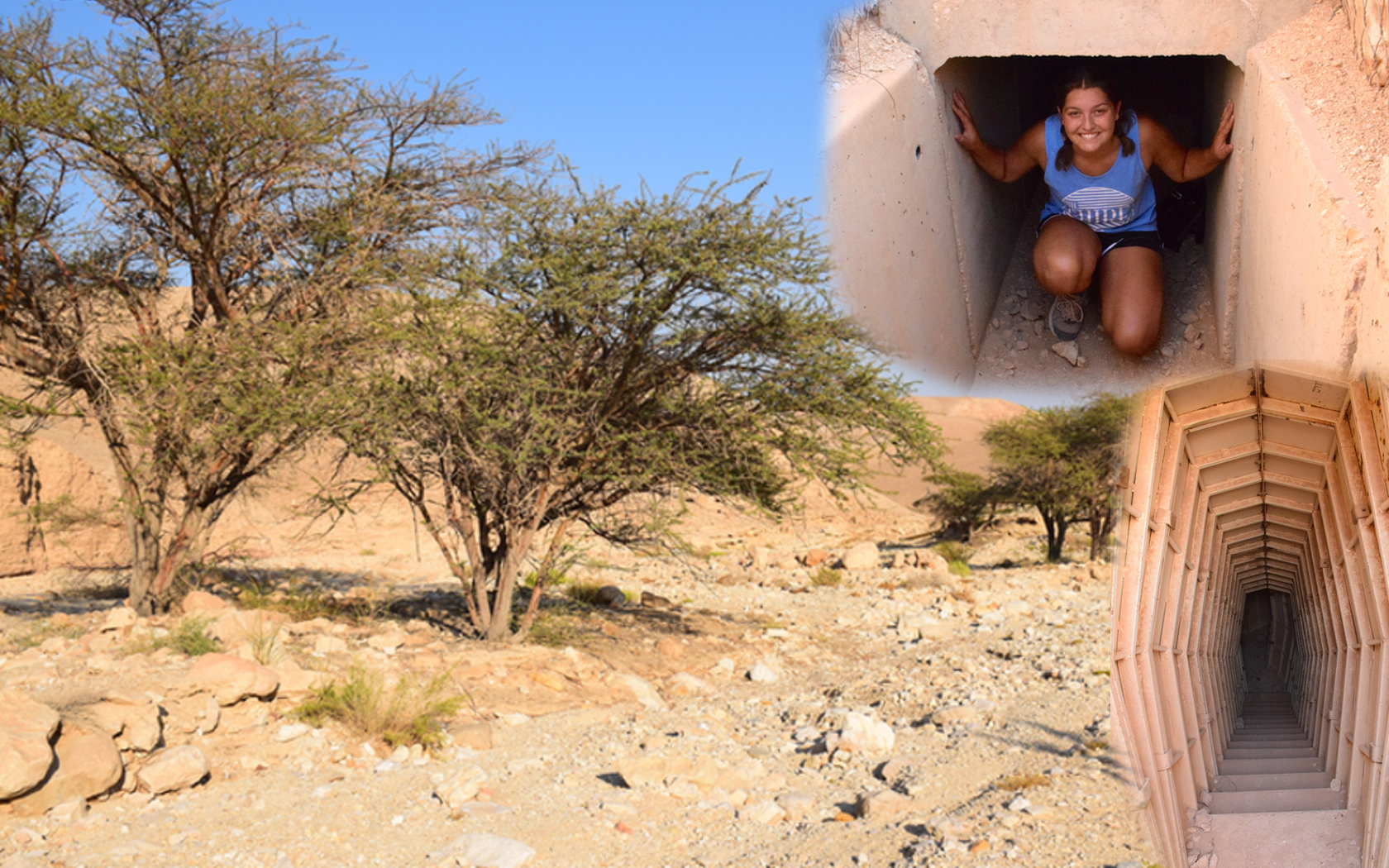 Because it was a holiday, I spent a good amount of time hiking in the desert, and this particular hike required more than one picture. One of the researchers with the institute, a seasoned hiker, took me on a new route, about five kilometers (total I think) to the north. We not only played in an old army outpost (okay, I played and he explained what everything was), but walked down a beautiful wadi that flooded in the last rainstorm (hence the abundance of things growing) and came down a new path to the kibbutz which featured a beautiful view of the Jordanian mountains just before sunset. We walked pretty fast and managed to make the hike in about three and a half hours. Later on in the week I went on a hike one morning down a different wadi (though equally beautiful) with some great rock climbing. I climbed up a crack and at the top there was a ledge to sit on, drink water, and survey the wadi twenty feet below. Unfortunately, I didn’t bring my camera on that hike, because at the base of the wadi I saw an ibex! Finally!