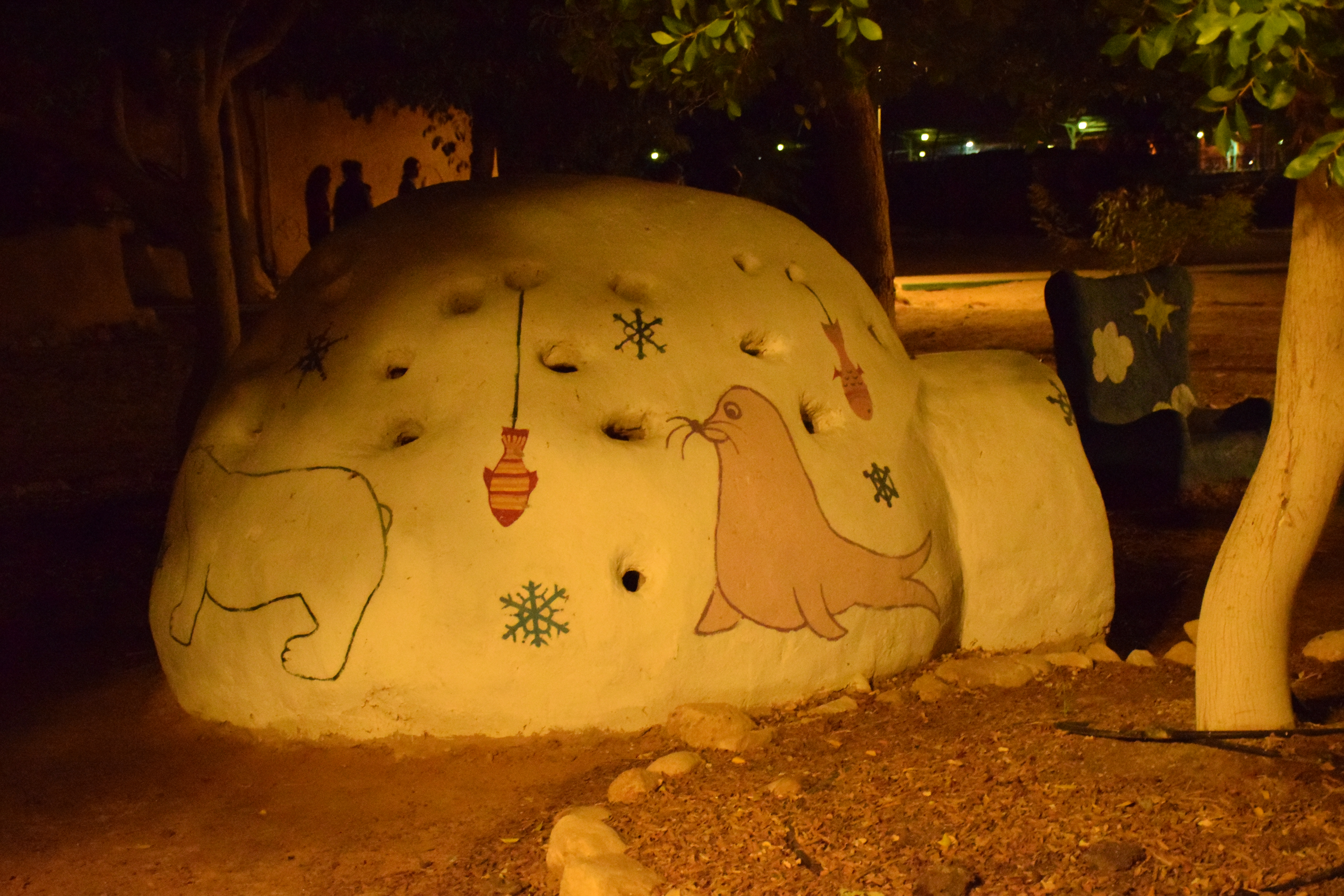 After the potluck I went with a small group over to Kibbutz Lotan, another kibbutz just up the road from us. They are rather famous (in the area) for their mud building and we were going to hear a lecture on EcoVillages. In the end, the lecture was actually about a networking group that helps people create EcoVillages, and EcoVillage is one of those misleading terms people use to make things sound greener. Although being environmentally friendly is a nice addition with EcoVillages, the point is that they are sustainable economically. Kibbutz Lotan was very cool though, below is a picture of one of their mud sculptures. Across the way from the igloo was a mud car with ladybugs painted all over it, but this seems to be more seasonally appropriate. The whole area was a sort of play area for kids with mud turtles to climb on, little mud tables to sit at and even a mud slide. One of Lotan’s tourist attractions is their tour of their sustainable set up, which includes all of their mud building projects, composting toilet etc. They also offer mud building workshops to people for 300 shekels (~$85) to learn how to create their own mud buildings.