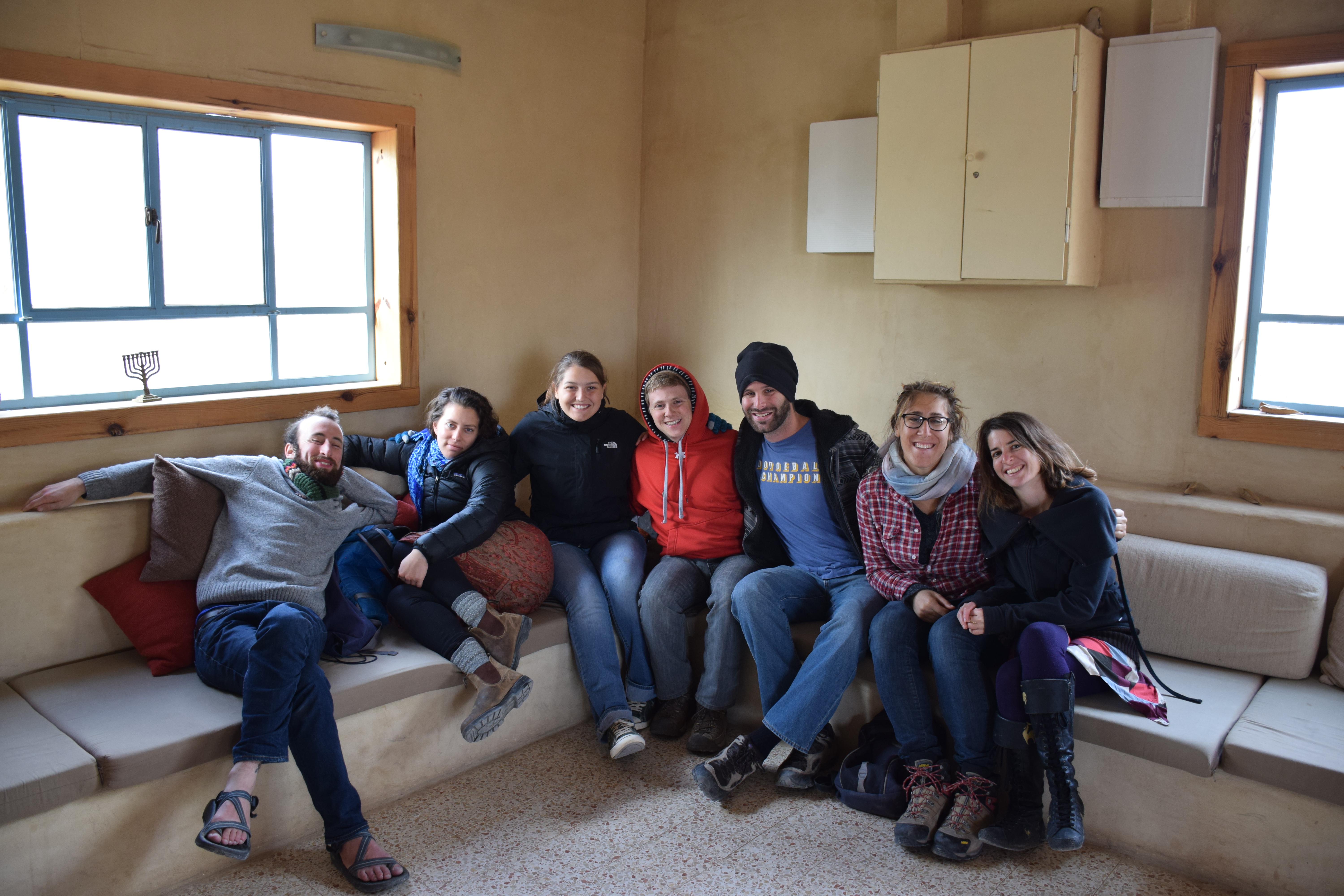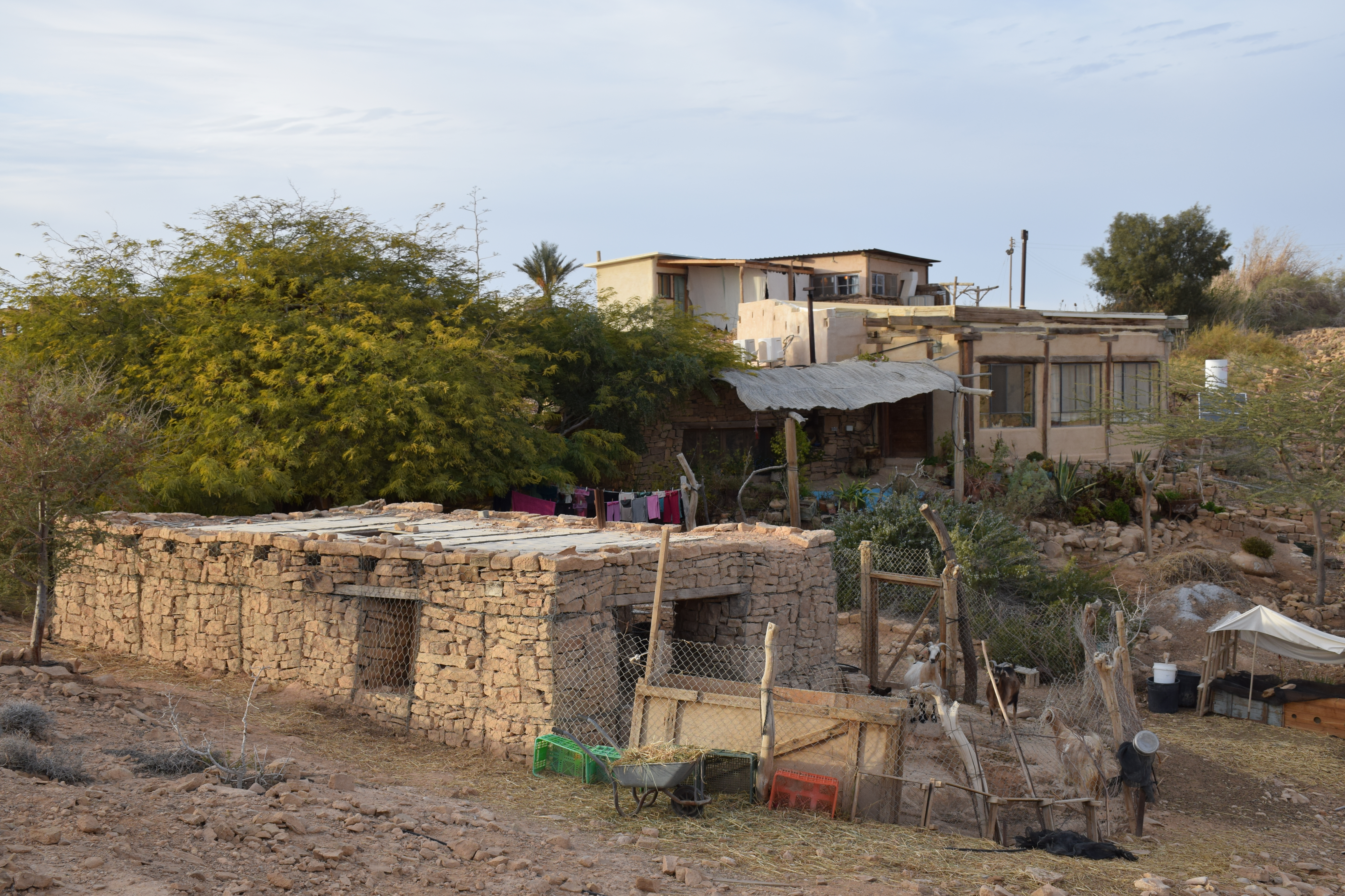 For our last Hebrew class we visited our teacher in her fascinating little town, Shaharut. Shaharut is one of the many illegal towns in the Negev, the people there created the town in order to have a little space separated from the rest of the world and build a community there in the desert. So they took the land and then started negotiating with the desert to get permission to have a village there, that was 35ish years ago. Now the community has grown to about three hundred people who each build their own house, though it has to attempt to blend into the desert. This leads to many interesting designs, using the stones from nearby as well as lots of mud buildings (such as the one we’re sitting in the photo below). Because they’re so far out of the way, many people own their own goats and chickens to supply them with fresh eggs and milk and then go to Eilat once or twice a month to stock up on other ingredients.