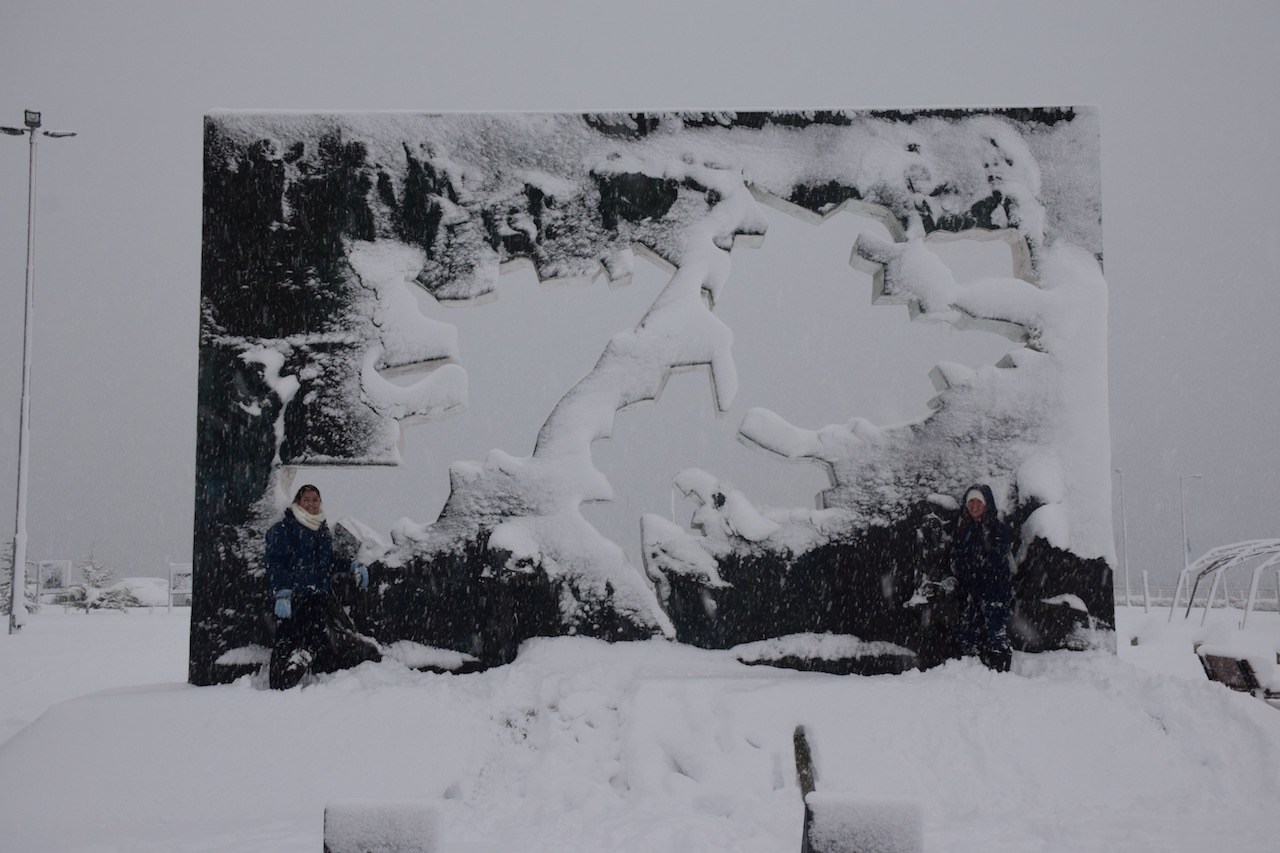 As I mentioned, Las Malvinas are a pretty big deal here, since they are quite close to Ushuaia. As of a few years ago, boats that visited Las Malvinas weren’t allowed to dock at Ushuaia, I think the restrictions have loosened a little since then. That doesn’t mean the people don’t feel very strongly about ownership of the islands! In addition to a few pieces of graffiti on the walls, this monument stands downtown next to an eternal flame and a wall of names, honoring those who fell in the conflict. Underneath the snow at our feet is an Argentina flag, I believe it claimed the Malvinas for Argentina but I’m not sure, I only got a quick look as we were driving away.
