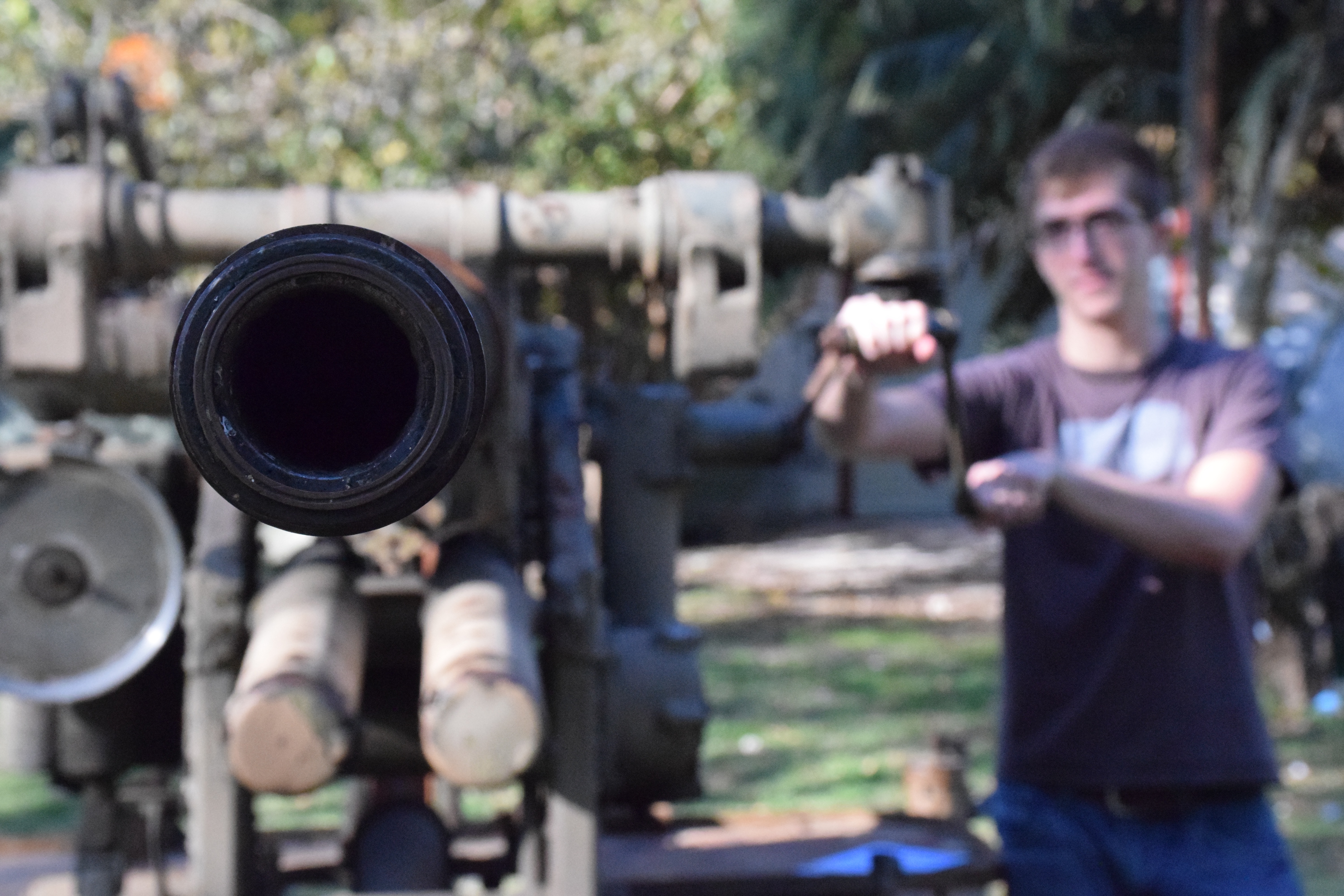 On our last visit to ESMA (you know, the former clandestine detention center with the Las Malvinas Museum) we spent a lot more time outside wandering the center rather than inside the museum. This was, of course, because we’d mostly seen everything inside of the Las Malvinas museum and wanted to explore the detention center. So we wandered through the buildings, went inside the ones that had exhibits or small museums inside of them and even examined the tank and machine gun that they had on the grass. Very surprisingly, both were somewhat functional, obviously they couldn’t shoot, but the barrel of the gun could be turned and lifted up and down (as my friend is doing in this picture).