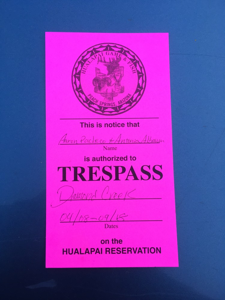 We both were impressed by the wording of the permit, a constant reminder that the land we were going on did not belong on the United States and we were only going because they were allowing us to be there. I appreciated the Hualapai taking what agency they could to make a political statement.