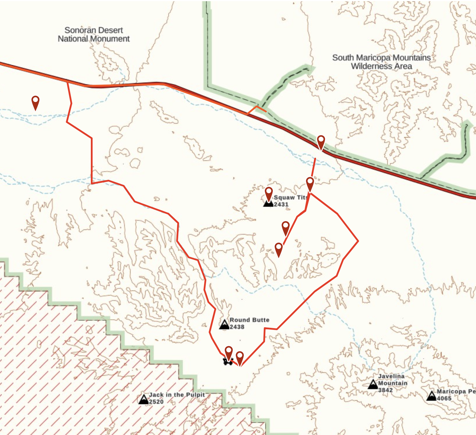 As can be seen in the above map, we first headed south to visit Farley’s Cabin, a little cabin tucked away in the saguaro filled hills. Along the way we passed by Squaw Tits mountain, so named for its resemblance to breasts. At least according to Wikipedia.