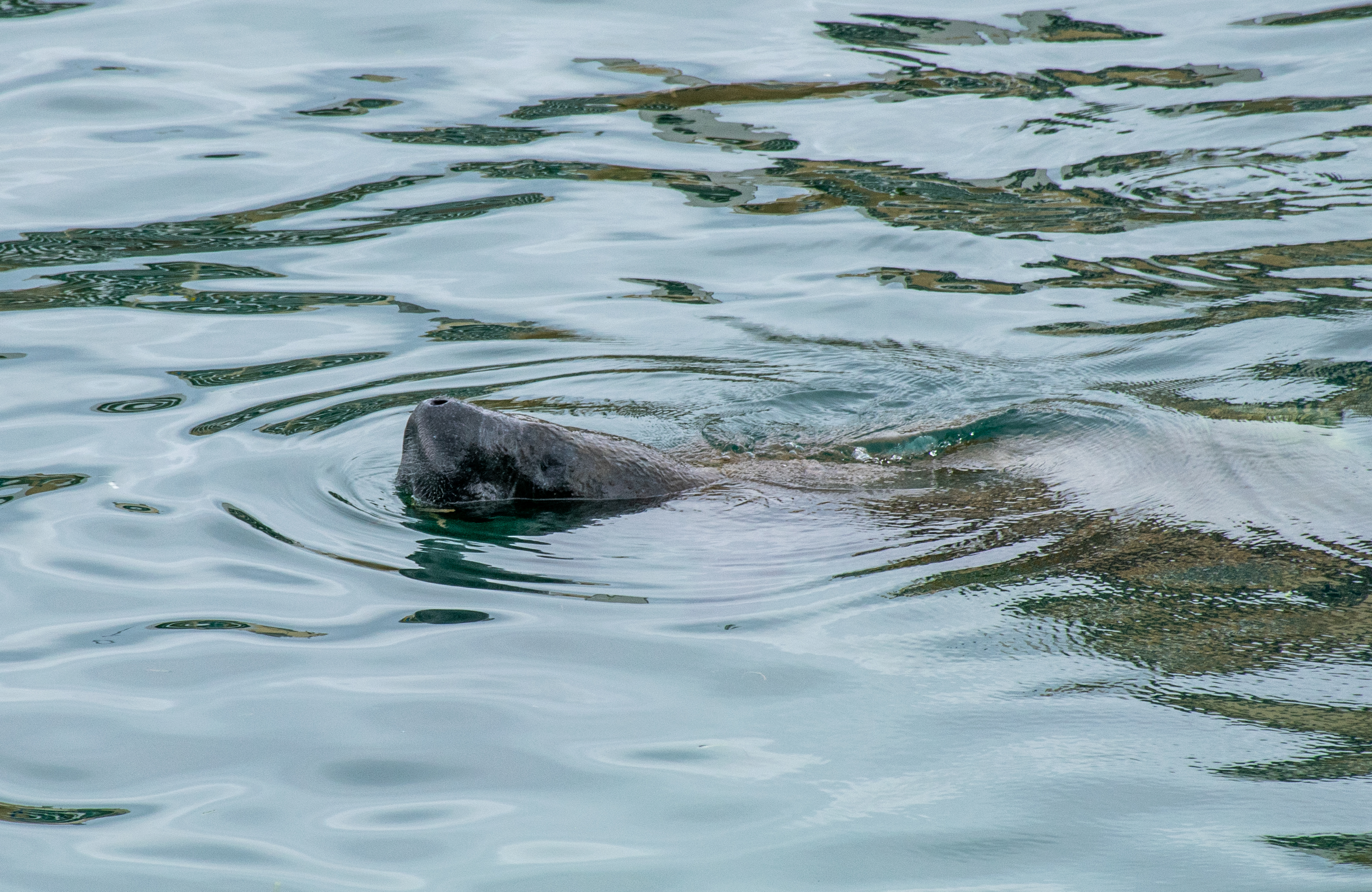 After thoroughly exploring the empty mall we began to walk back to our hotel, deciding that perhaps it was time to start making our way towards the ship. As we crossed the bridge that connected the two ends of the little bay, I started seeing a huge dark shape in the water. Four pairs of eyes were focused intently on the water and were well rewarded by two manatees alternately and simultaneously poking their noses out of the water. The cloudy day meant that their bodies were well obscured under the water so we only really saw what they deigned to poke above the water, and, sensing our presence (or perhaps hearing us exclaiming excitedly) they did not deign to put anything other than their noses and maybe an eye above the water. Jerk sea cows. Nonetheless we got some photos of the manatees noses.