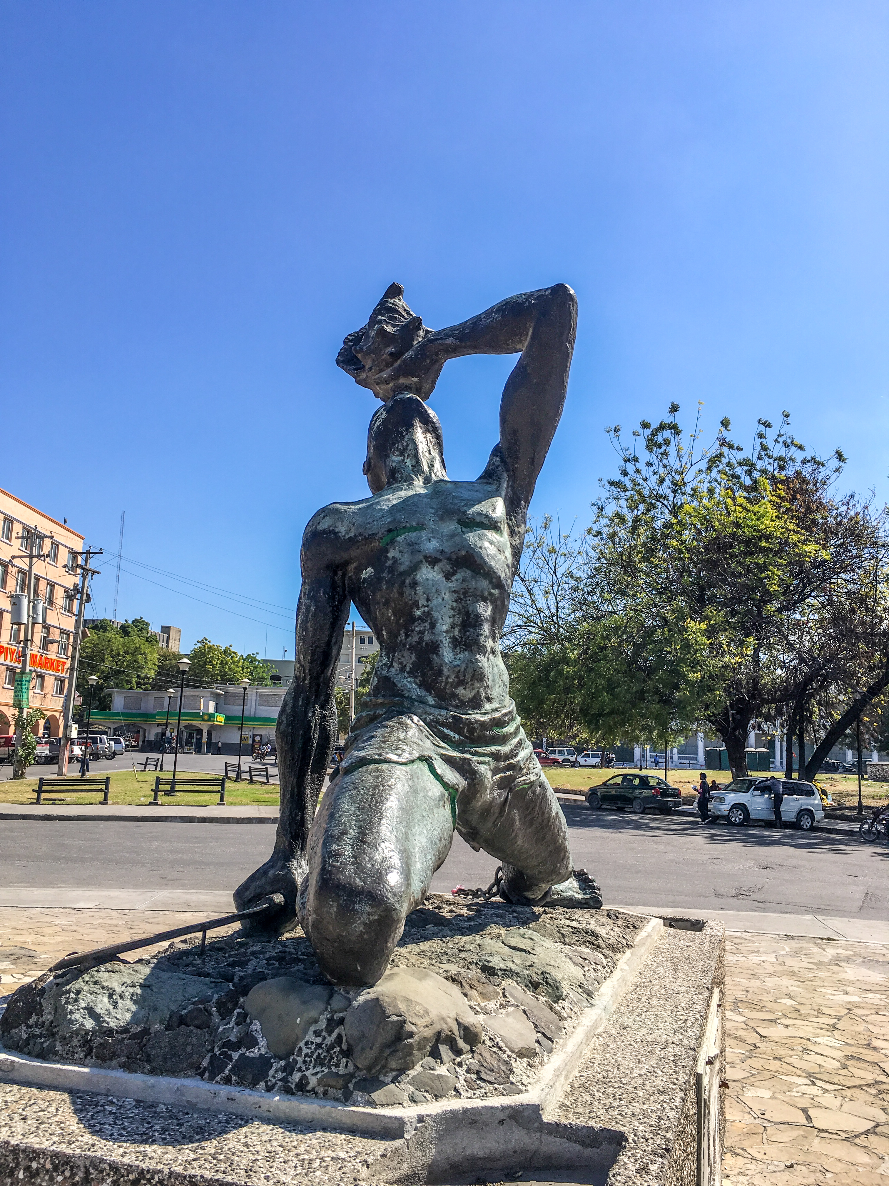 All in all it was a very successful visit to the Pantheon and I was glad we’d had Claude to arrange to have the museum guy show us around. After the museum Claude walked us over to the presidential palace and a statue of a runaway slave. It was a statue of a slave blowing on a conch shell horn with a chain around his ankle, the end of which was loose and could be played with, and Claude told us that he was the first slave to runaway and encouraged others to do so and created places for them to hide in the forests.