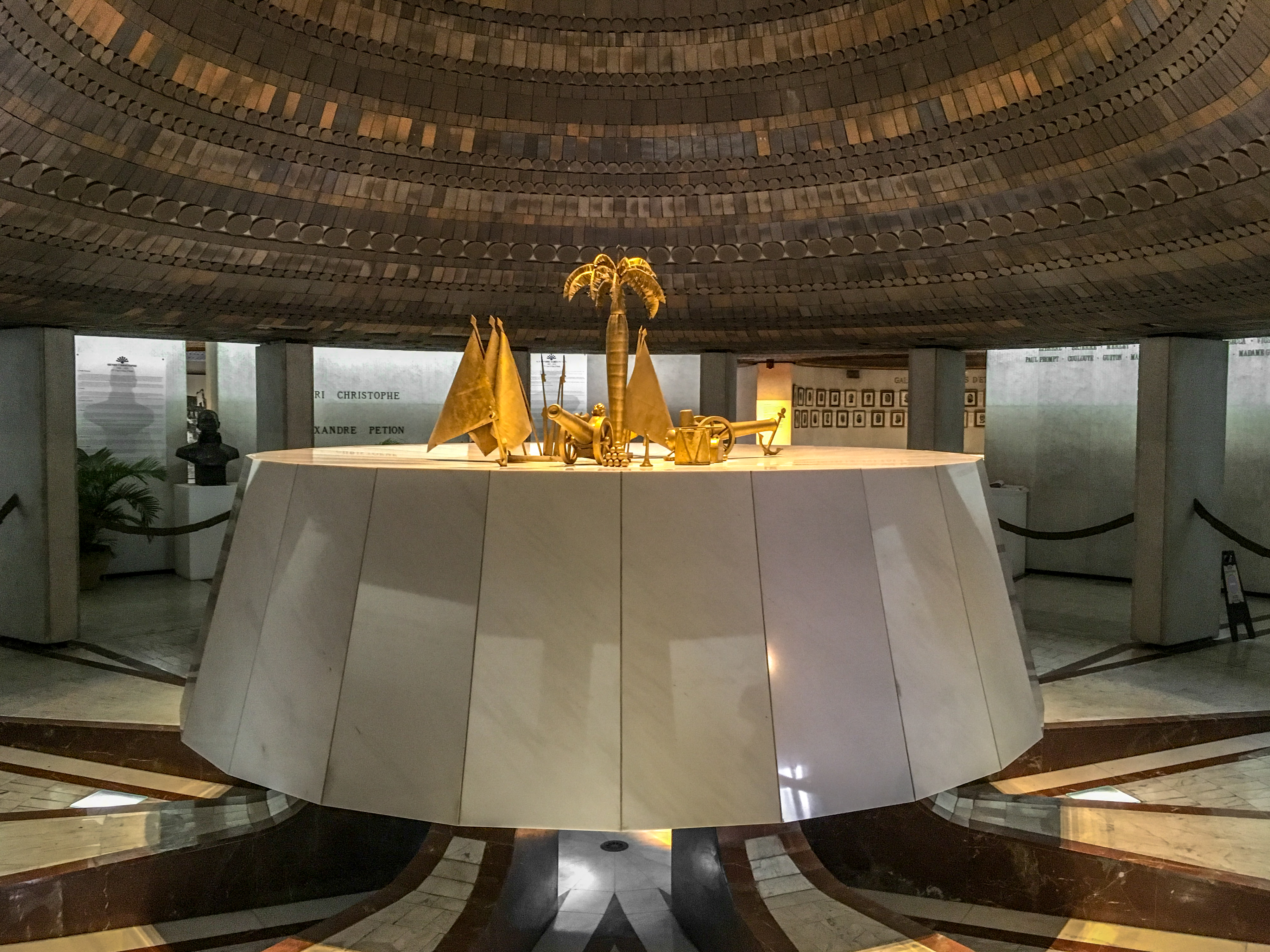 When first walking in, you see a tomb which our guide explained held the remains of Jean Jacques Dessalines, Henri Christophe, Toussaint, and Petion. These were the heroes of the Haitian Revolution. On top of the tomb was a collection of little statues, some flags, some cannons, plan trees. It didn’t really make sense as a decoration until the museum guide held out the flag near the tomb and showed us that the motif on top of the tomb was a 3D re-creation of the drawing in the center of the flag. Suddenly it all became a lot cooler.