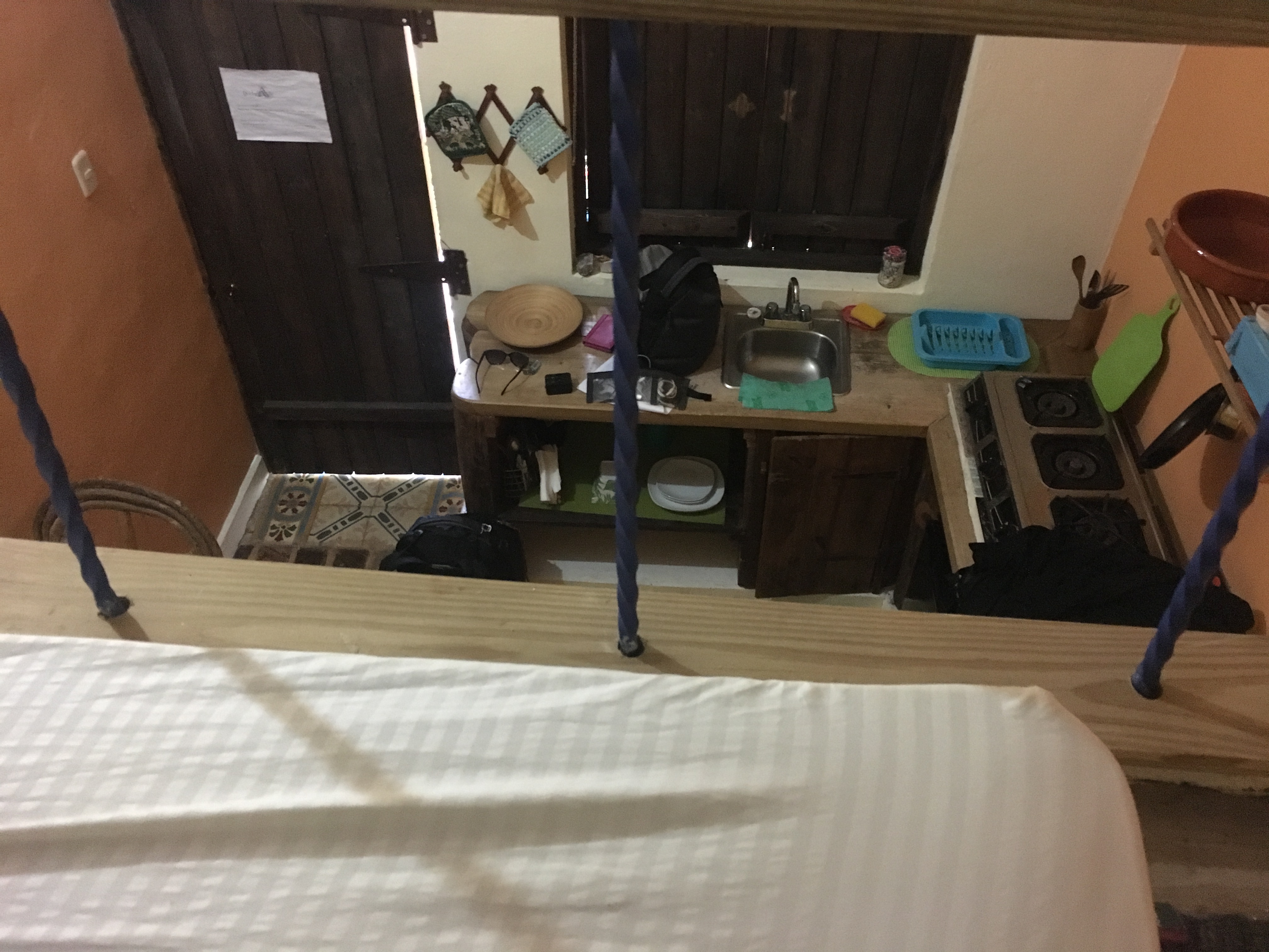 We stayed at La Choza guesthouse on the edge of the Colonial Zone in Santo Domingo and they put us in our own little one room cottage! It was an awesome square room with a rectangle partitioned off (so it was a rectangle within a square) and that became the en suite bathroom. The remaining room outside the bathroom became a little kitchenette and dining room while the bed was put loft-style on top of the bathroom. The whole thing was designed to be open air with lots of windows that opened into different sides of the building.