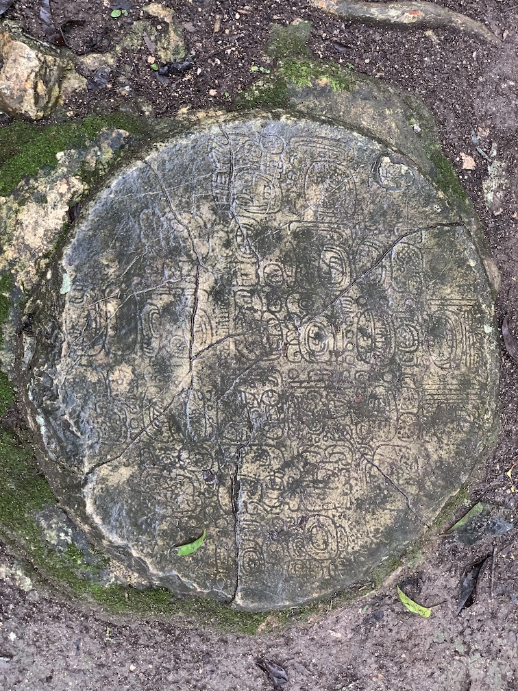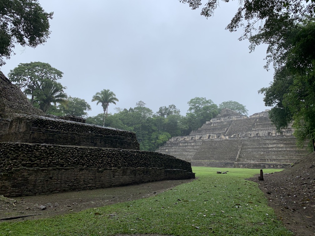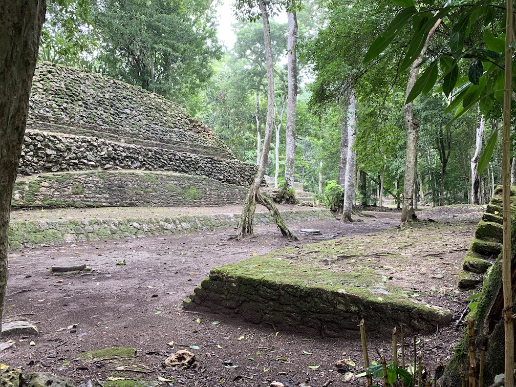 Eventually he found a rock that had punctured the tire. With an air of having dealt with this a million times, Aaron pulled out the jack and the other tools needed to change the tire and then started jacking up the car. Then he realized that the jack was too short. Aaron undid the jack, pulled it out, rolled the car back onto a different section of the parking lot and then tried again. It still didn’t fit. At this point we wandered over to the soldiers who were watching us underneath the covered seating area and asked if they had a different jack. Four of them walked back to the car with Aaron, I went to use the restroom and then hung out with the soldier who stayed behind and asked him about what life was like guarding the ruins. As he told me about the two week shifts he worked there and silently expressed his boredom with sitting around the ruins all day, we heard lots of chatter from Aaron and the soldiers as they used wood to create a solid surface for the jack to rest on and add height, and then jacked up the car. The soldier asked me if we had seen any jaguars or tapirs since they are occasionally seen on the drive in. Loud banging followed as the soldiers and Aaron whacked the tire off (it was the wrong kind of wheel for the car and the thing had swollen in the heat, and ask Aaron for more specifics)[Aaron has requested that I point out that the loud banging came from swinging a tree trunk at the rim to get it off]. The solider and I sat silently contemplating the other tourists who had just sat down with their guide to eat a snack at the other end of the covered seating area. Eventually all of the soldiers dispersed and I returned to the car to find Aaron tightening the last bolts on the new tire. Once he had finished and we put everything away, I went and paid the entrance fee for the ruins. Finally we began our short hike into the ruins.