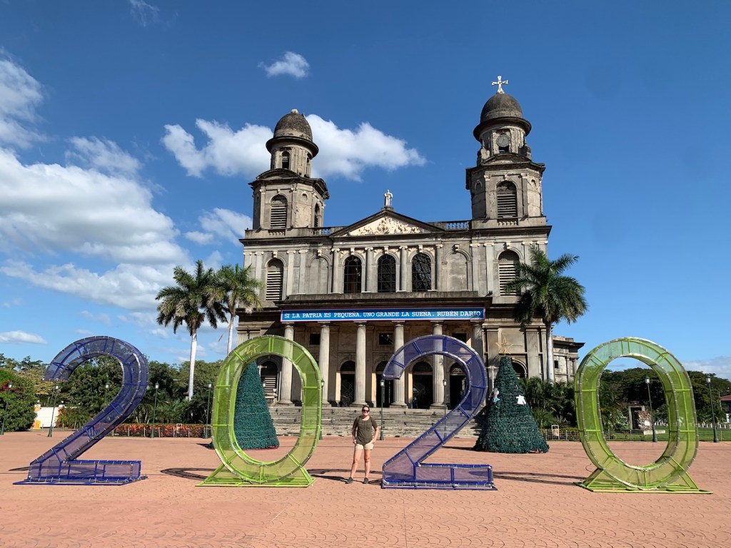 One wild cab ride later we were deposited in our hostel where the owner, Michael, showed us our room and confirmed that we were all set to go see the Masaya Volcano that evening. He said we were the only two on the tour so far and that it was a quiet evening so he expected it to stay that way. Taking advantage of having five hours to kill before our tour, we walked to the nearby mall and pulled out the thousands of Córdoba (really only a couple hundred dollars) that we expected to need for this section of the trip. From there we decided that it would be a fantastic idea to walk downtown to the old cathedral and some cool tree statues that we saw next to the lake.