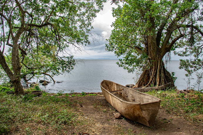 We ended our jaunt around the island at Punta Jesus Maria, a long stretch of sand that, when the lake has more water, can give the illusion that someone is walking on water. Due to the low water levels and the angle of the sun, the effect was less pronounced and we decided to return in the morning to take photos. We did, however, stop at the tourist shop so I could buy a keychain: a small scrap of coconut shell with a drawing of Ometepe scratched into it.