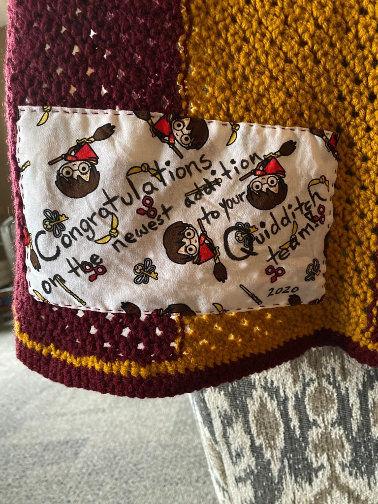 With the blanket blocked, it was time to add the label on the back! After doing some brief research on the internet, I decided to buy the Arteza fabric pens based on the good reviews it received and in the hopes that they wouldn’t wear off. I found some fantastic Harry Potter fabric and grabbed a friend with better handwriting than mine to inscribe “Congratulations on the newest addition to your quidditch team!” on the fabric before hand sewing it to the back of the blanket on the other side of the snitch.