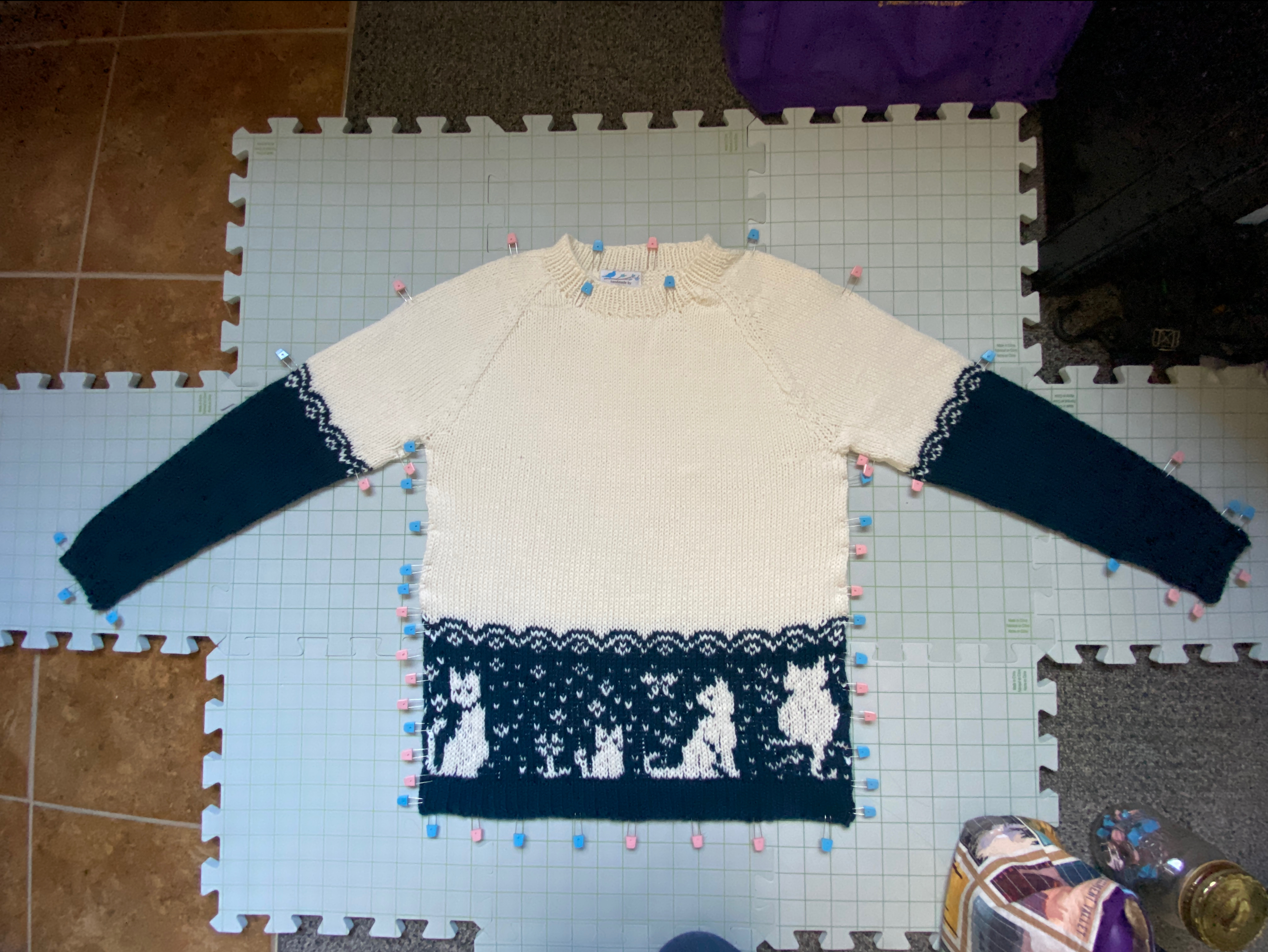 The most challenging part of this sweater was clearly the cats color work. Having done color work in the past, I felt ready to tackle this and I ended up cutting out and taping together the row of eight cats, writing in the stick marker colors between each one, and then counting twice for each row. Despite all of that preparation, I managed to miss a couple stitches here and there and the tension was not nearly as even as it has been in the past. Once past the cats, it was smooth sailing to create the sleeves and shape the neck. Creating the diagonals during the decrease section once the sleeves were attached showed me why my “cheat” for ssk stitches would no longer work and I stopped cheating in order to create the straight diagonal lines that I saw in the photos of other projects.