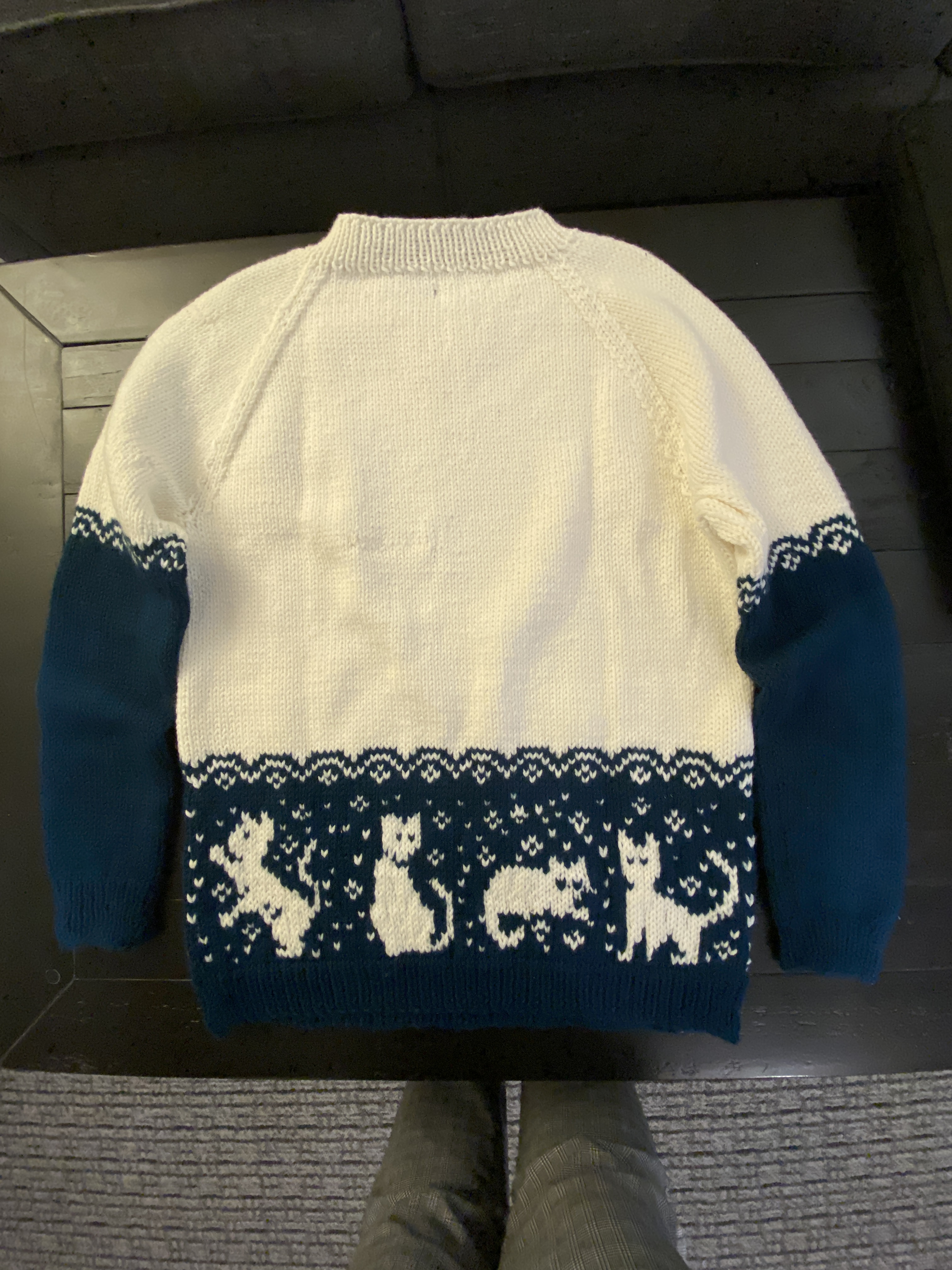 At the time of making this, my cousin’s (9 y.o.) favorite colors were teal and pink. And while I couldn’t bring myself to make a teal sweater with pink cats and a white top, I thought a teal base and white top would fit her color choices, and of course she loves cats. The teal yarn ended up being much darker than I expected, but seen in the sunlight it lightens up and shows off all of the different hues of the dye. It’s a rather spectacular show when seen in the sun, but I suspect this sweater will not often be worn in the sunlight as it will have a jacket covering it. I knit her a kid’s size twelve, but due to my own uncertainties and fears of making it too small, I let my gauge go up a little and made it a little longer in the sleeves and hems and it looks more like an adult small…She’ll grow into it!
