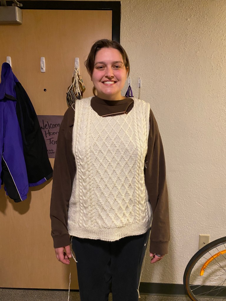 About halfway through the project I regretted using some cheap acrylic yarn from JoAnn’s because I was loving how the sweater came out, but the completed project looks nice and is super warm as well!