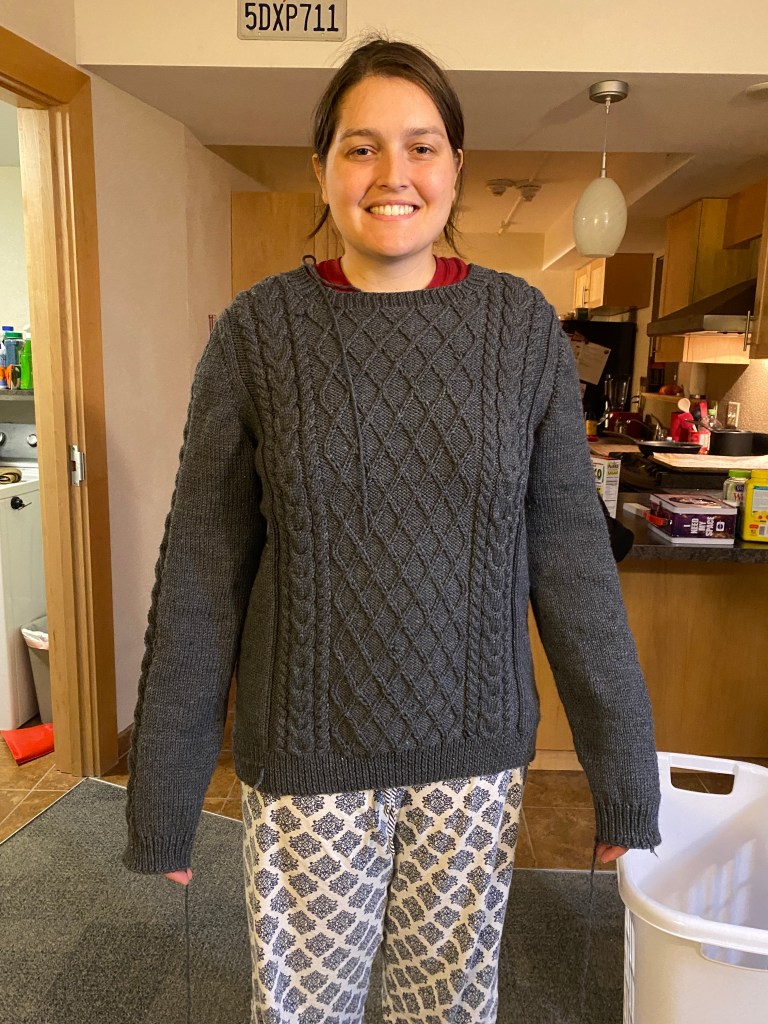 I gave the sweater to my mom before taking a photo, but I liked it so much that I made myself a second one! (Note the overly long sleeves)