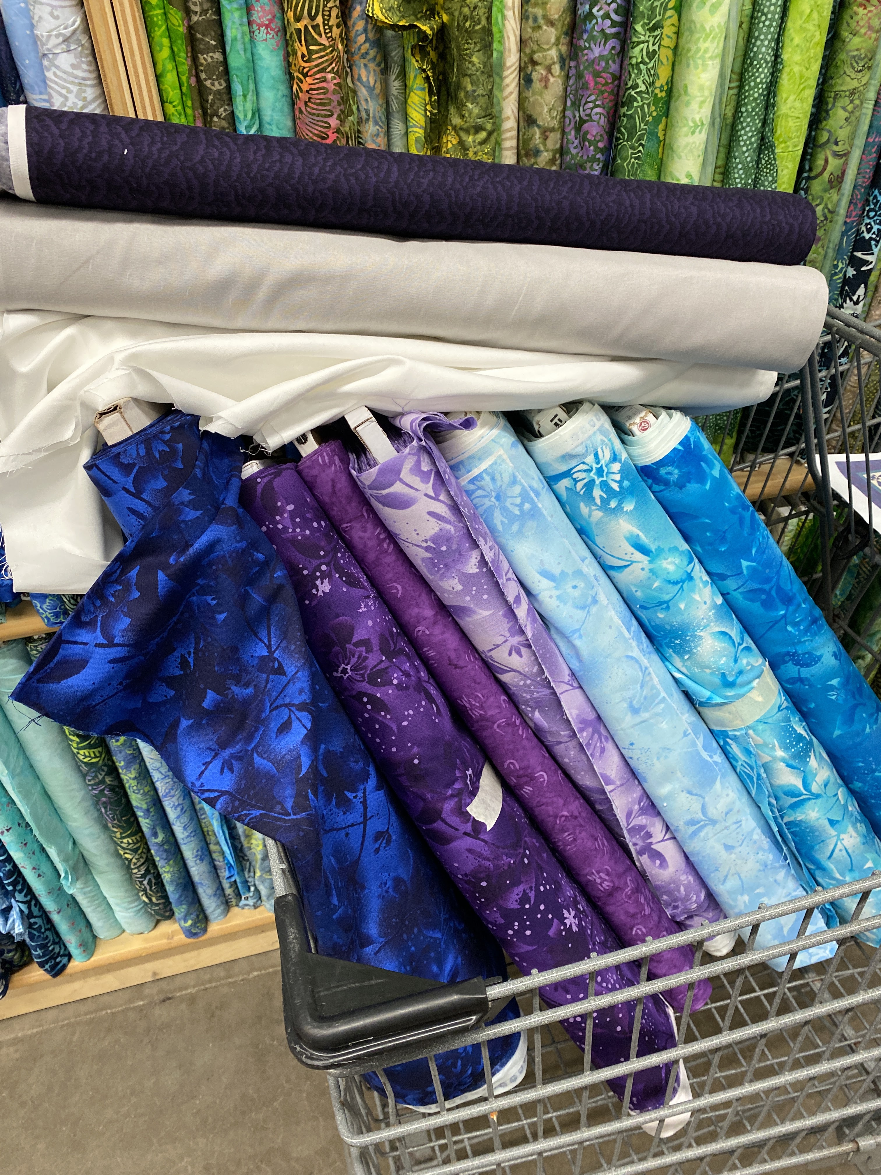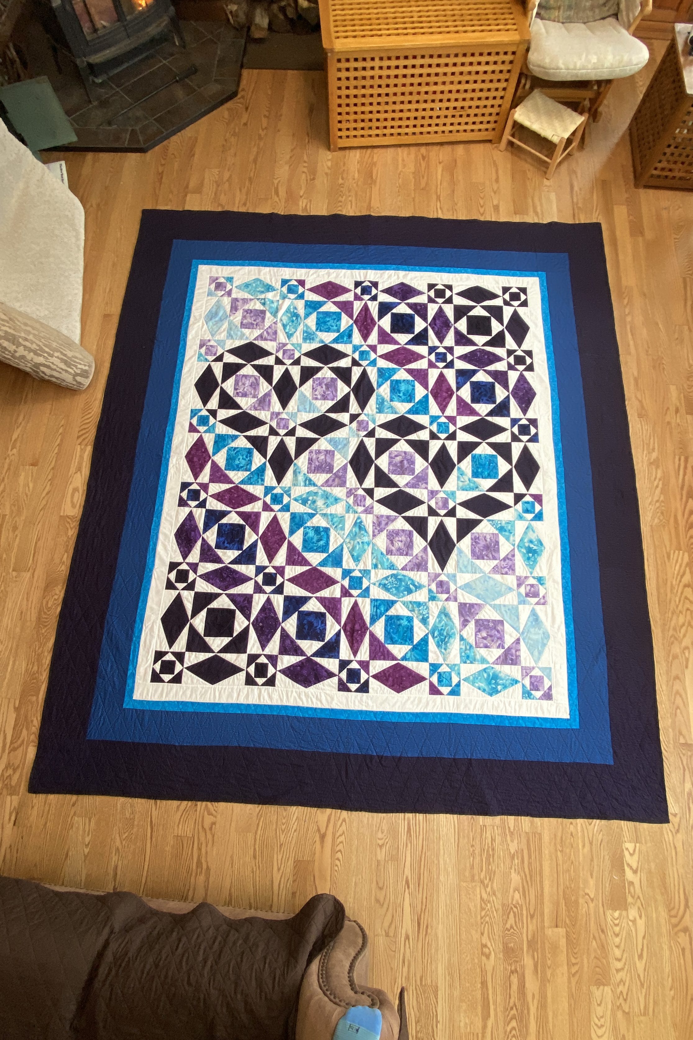 Fabric: 100% Cotton quilting fabrics + batiks. This pattern uses 10 different colors of fabric which makes for a complex shopping trip! While the pattern does a good job of trying to match each color with a designating letter that it then refers to throughout the pattern, the photos aren’t perfect so it took me awhile to match each fabric with the correct letter. I used four different shades of purple, four different shades of blue, white for the background, and a light gray for the edge border. Because this quilt was going to be slightly up-sized to a king quilt, I also added an additional border to add on the extra inches.