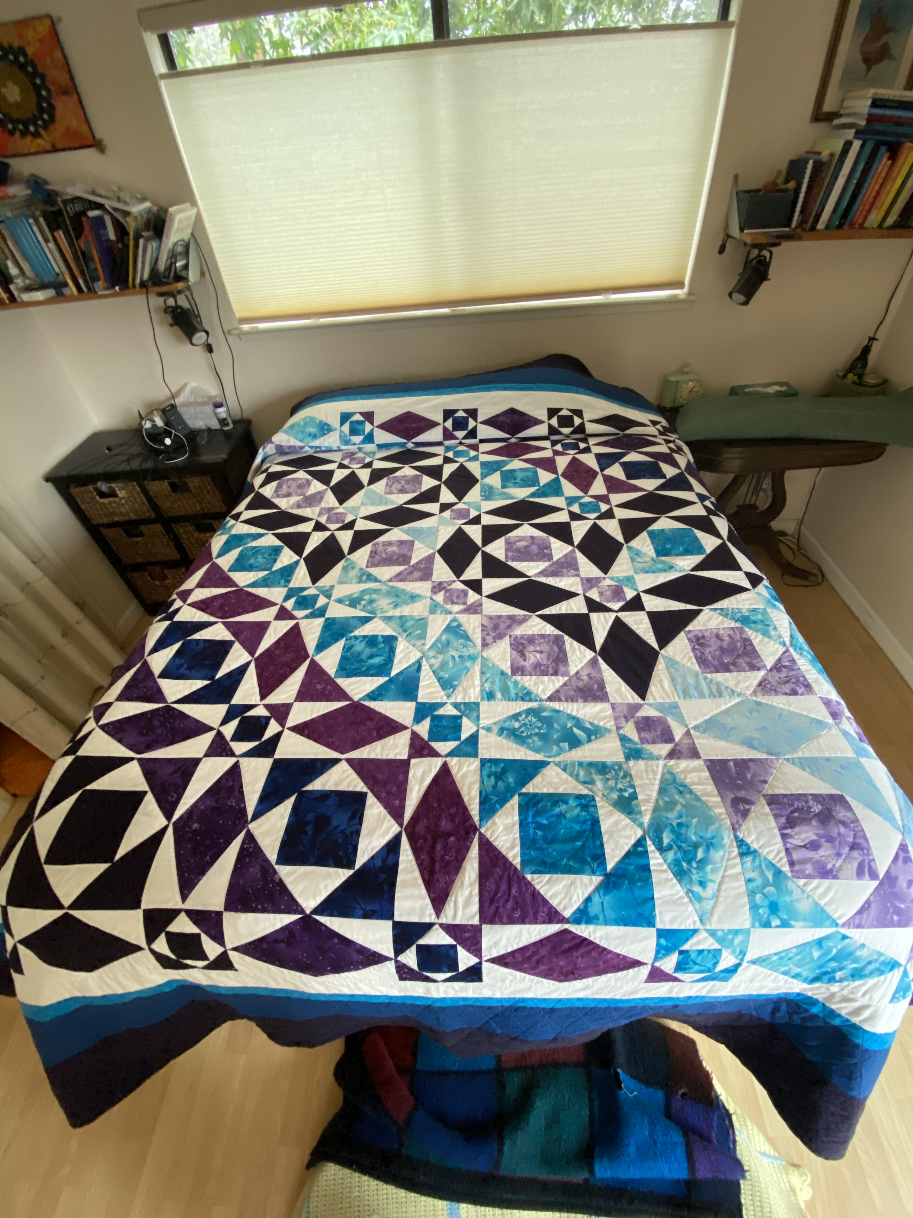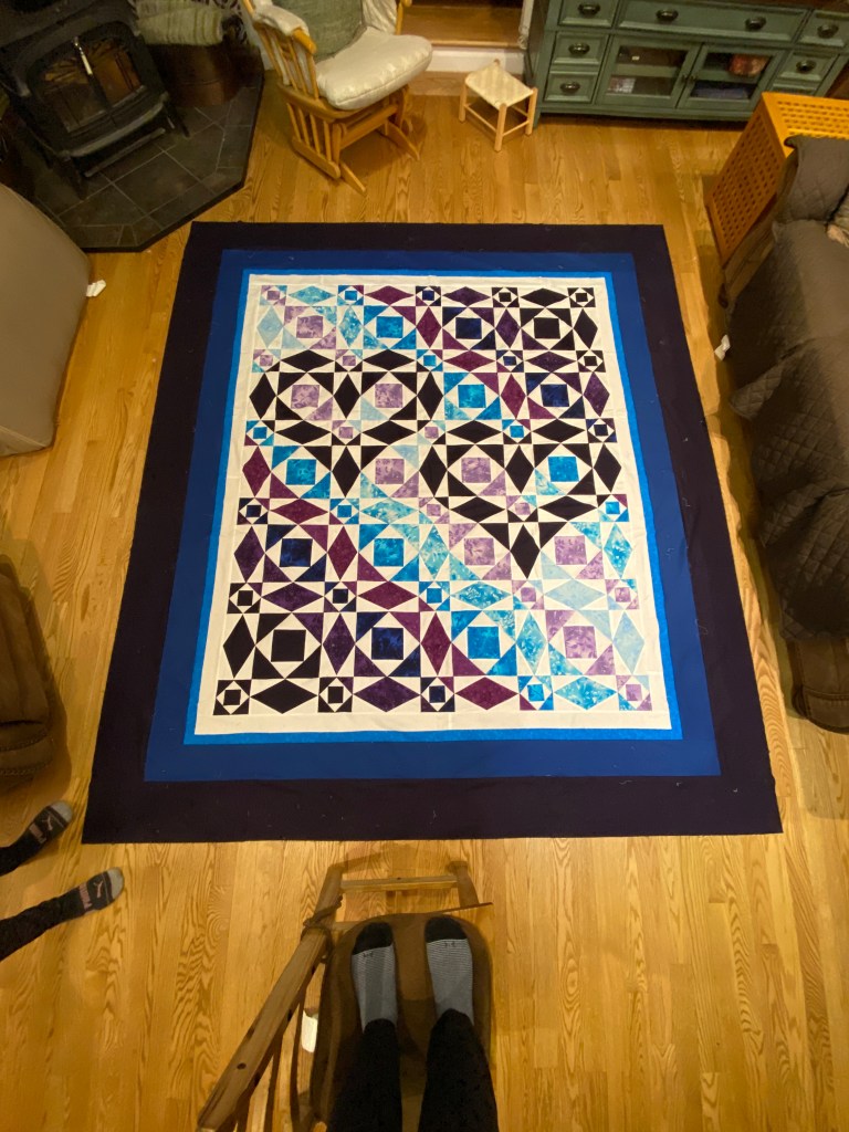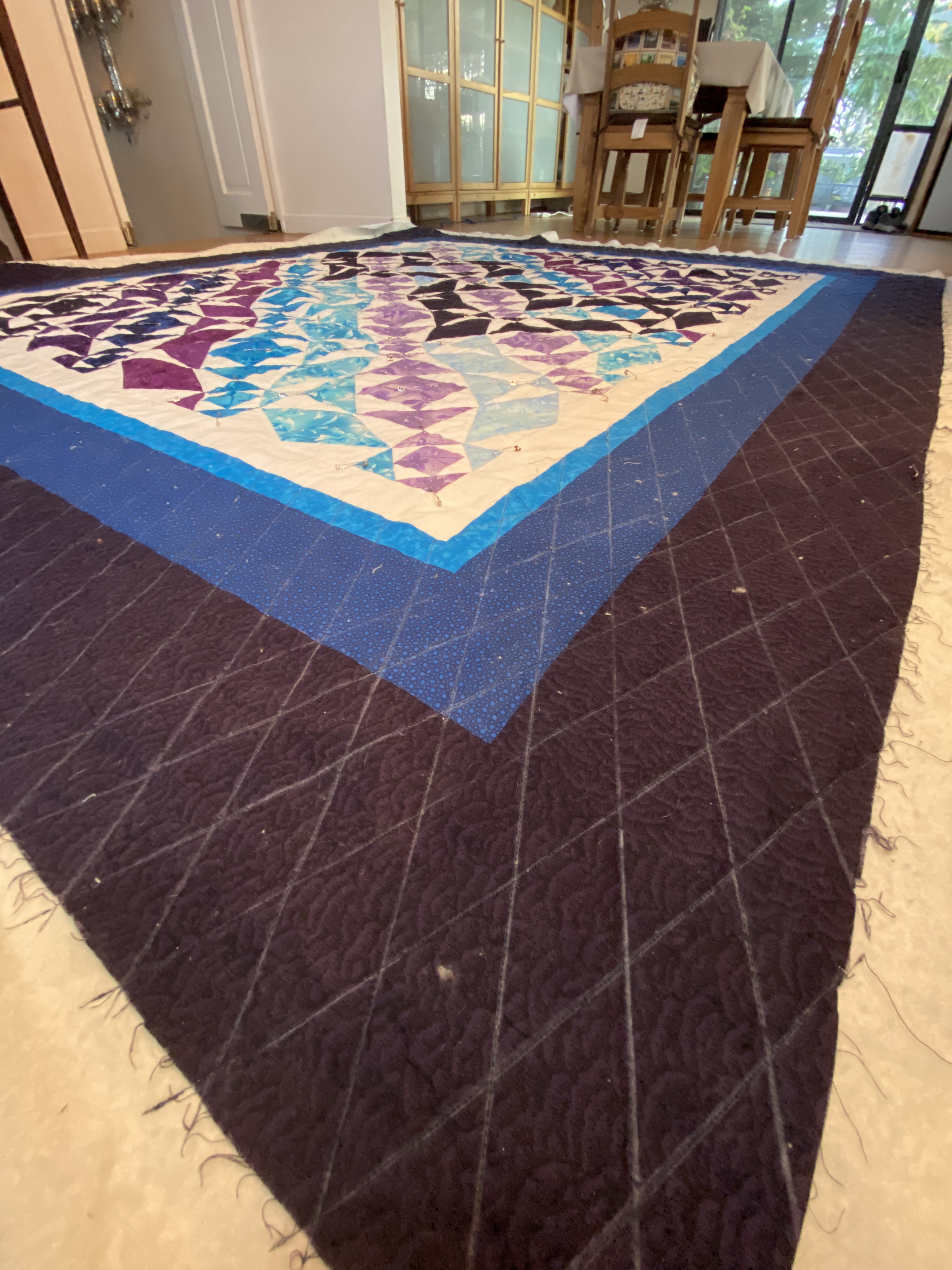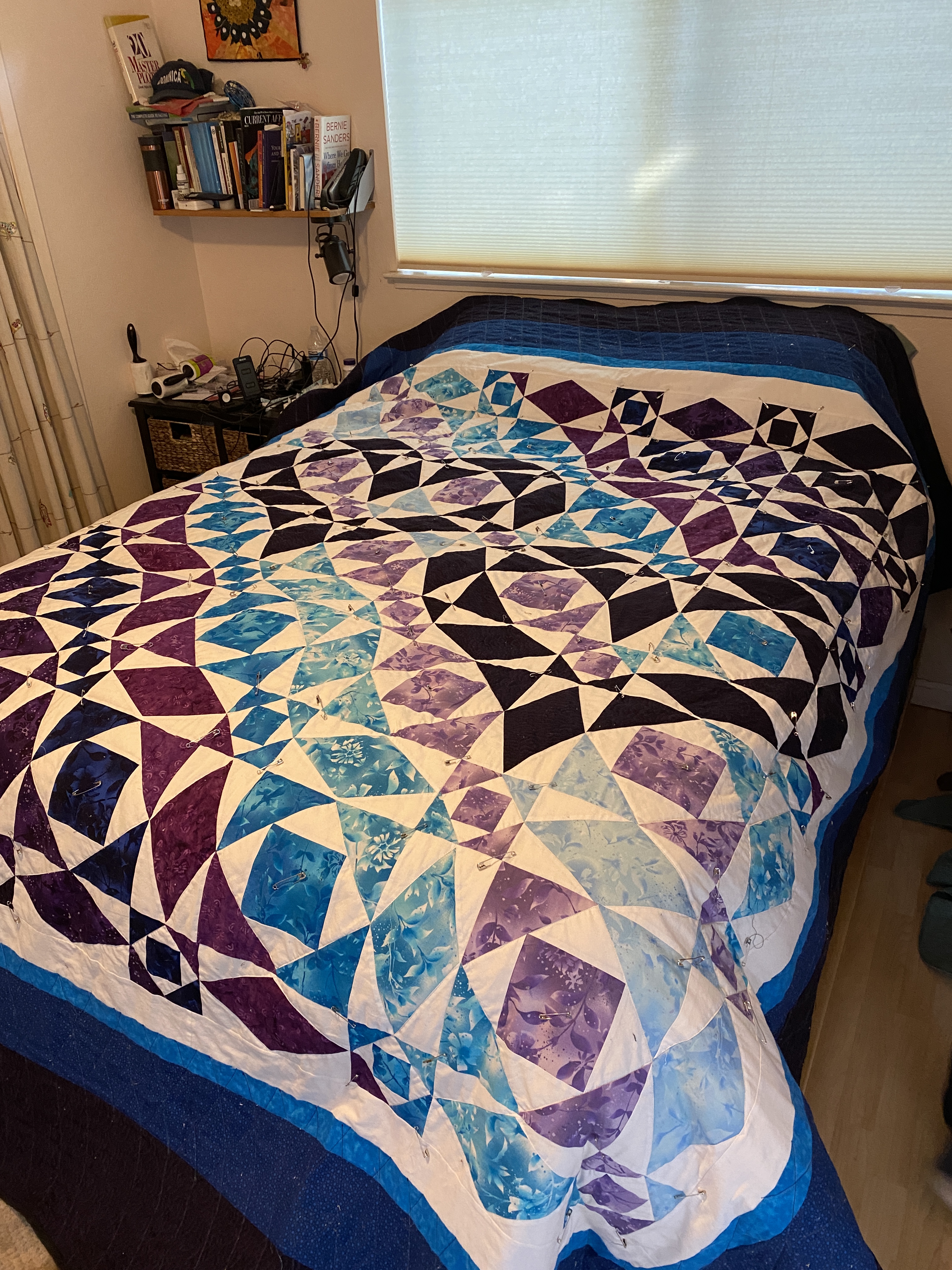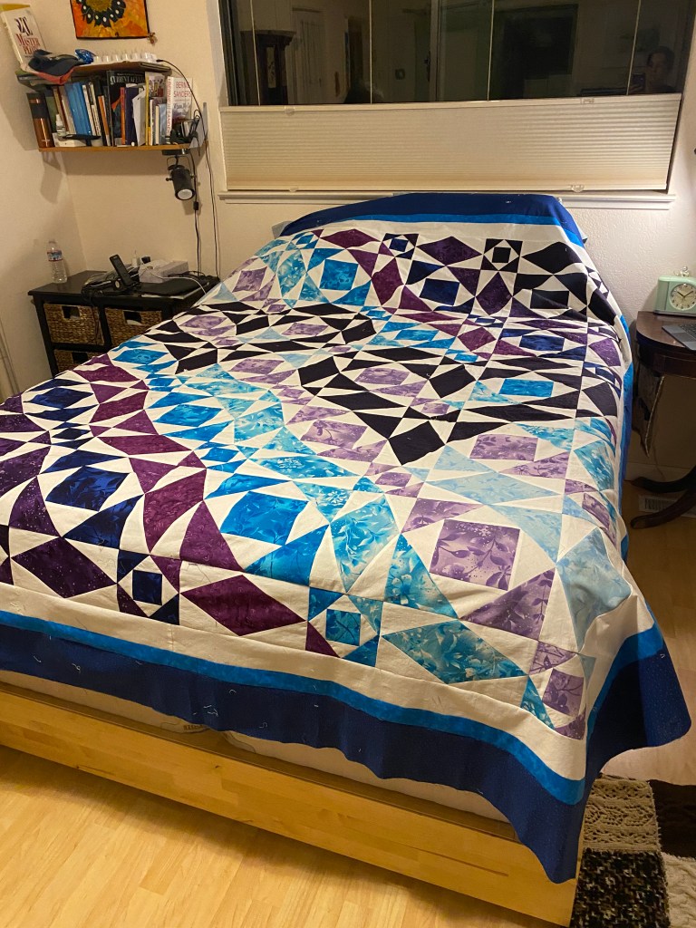 The next trip to California, a post-semester trip in May, was highly productive with us finishing the quilt top and adding the border, enough for it to fit a king size bed. As we added the border, we ditched the original gray fabric I had bought, instead opting for white fabric which matched the overall design much better.