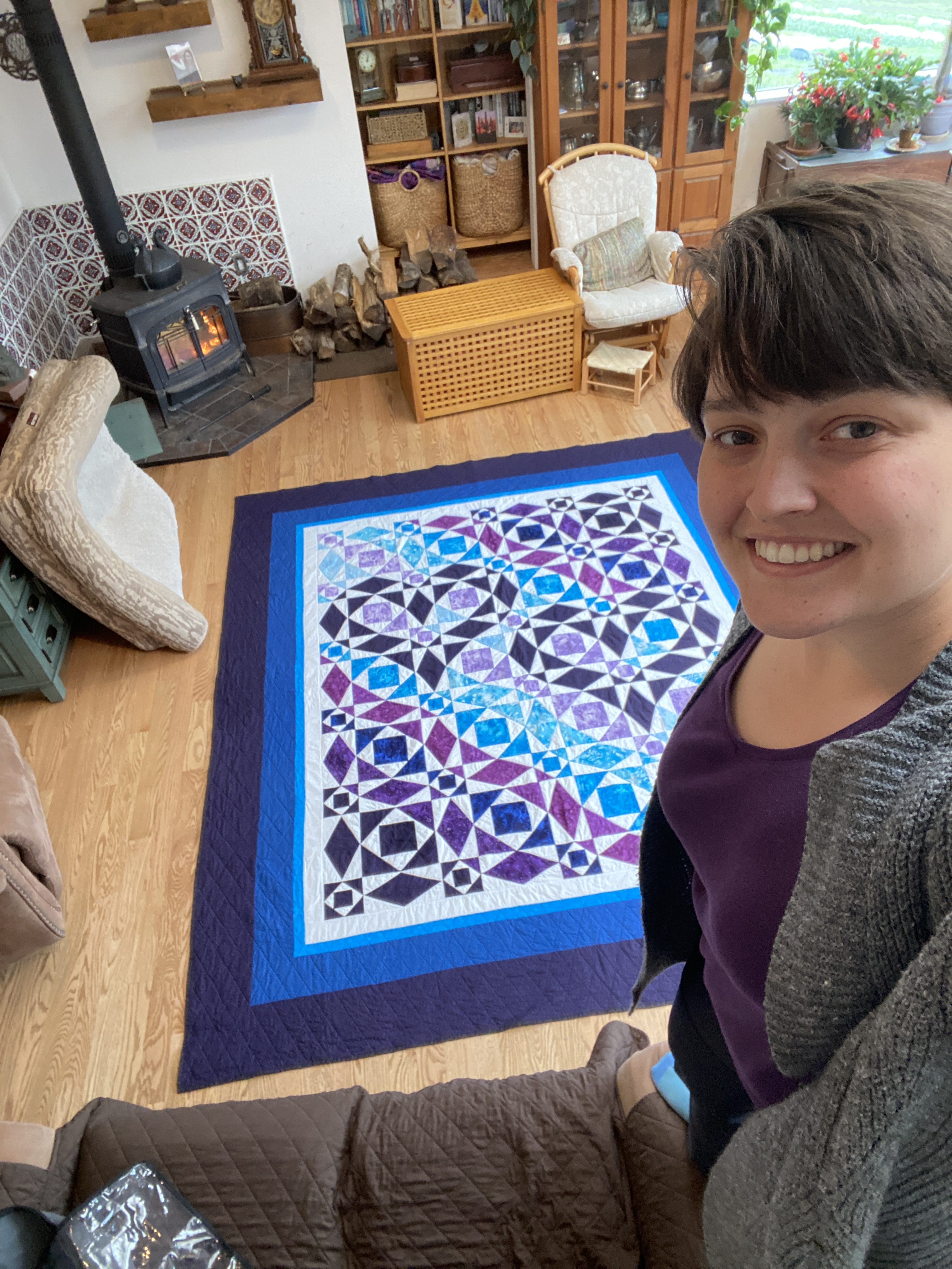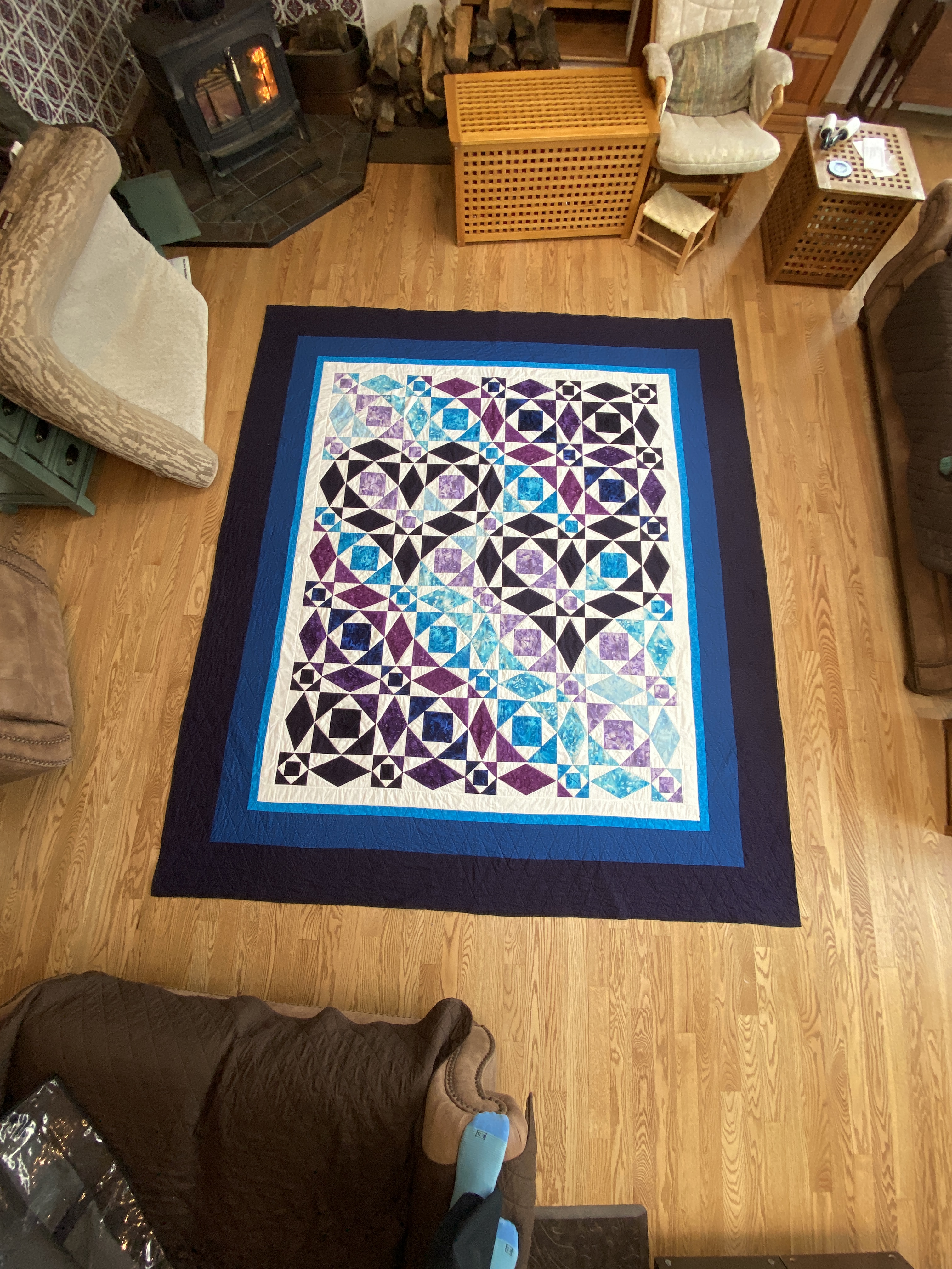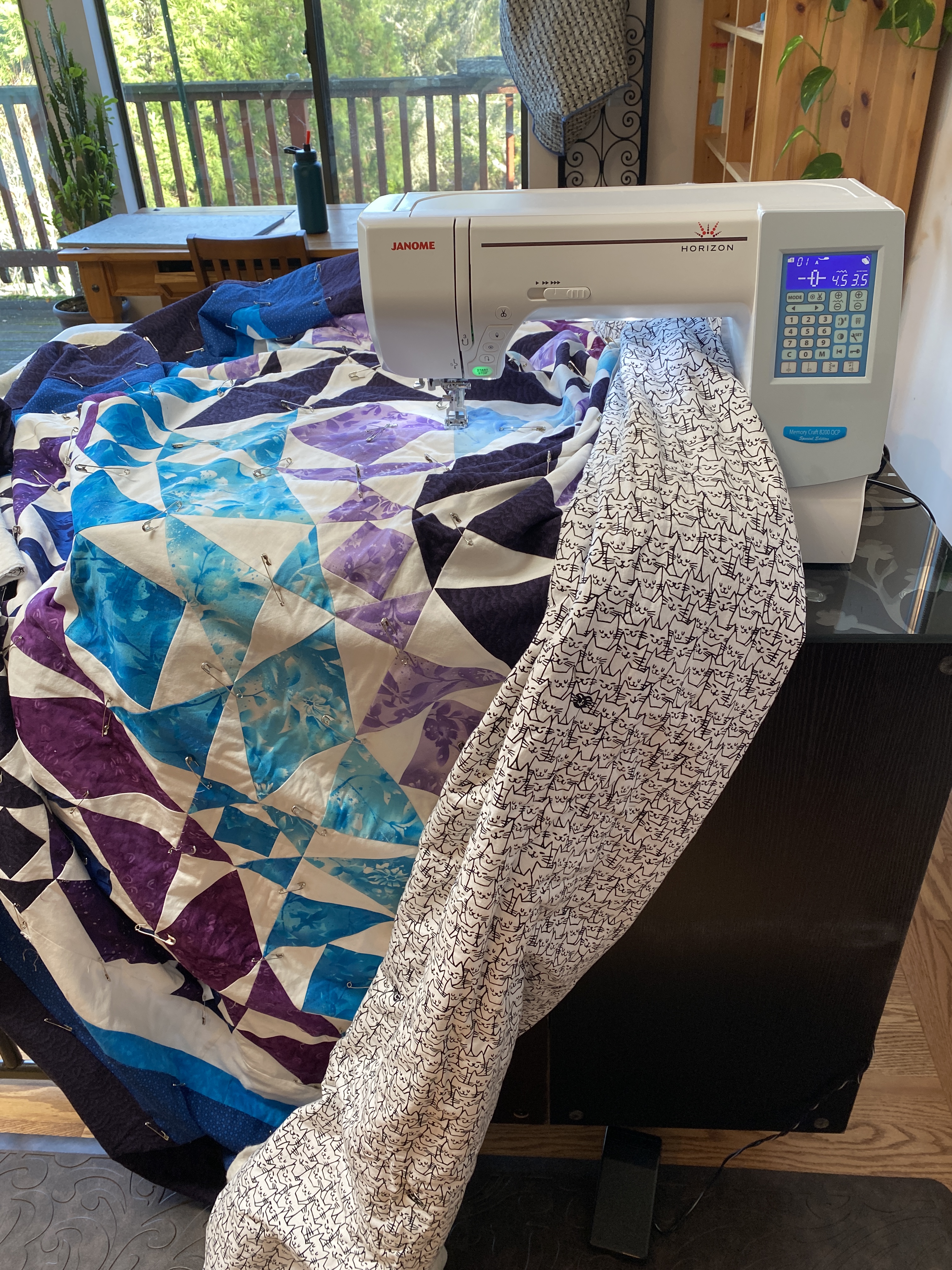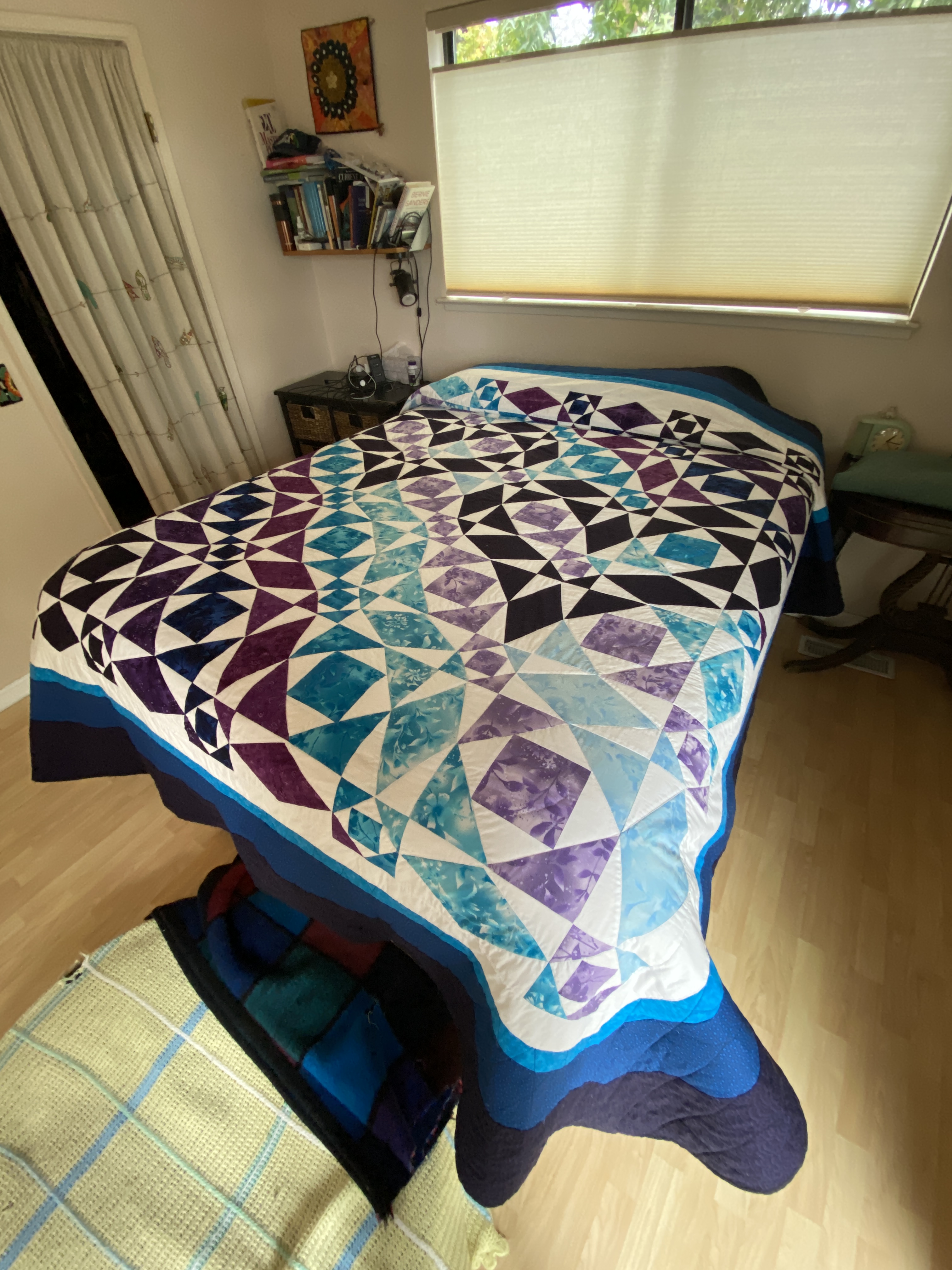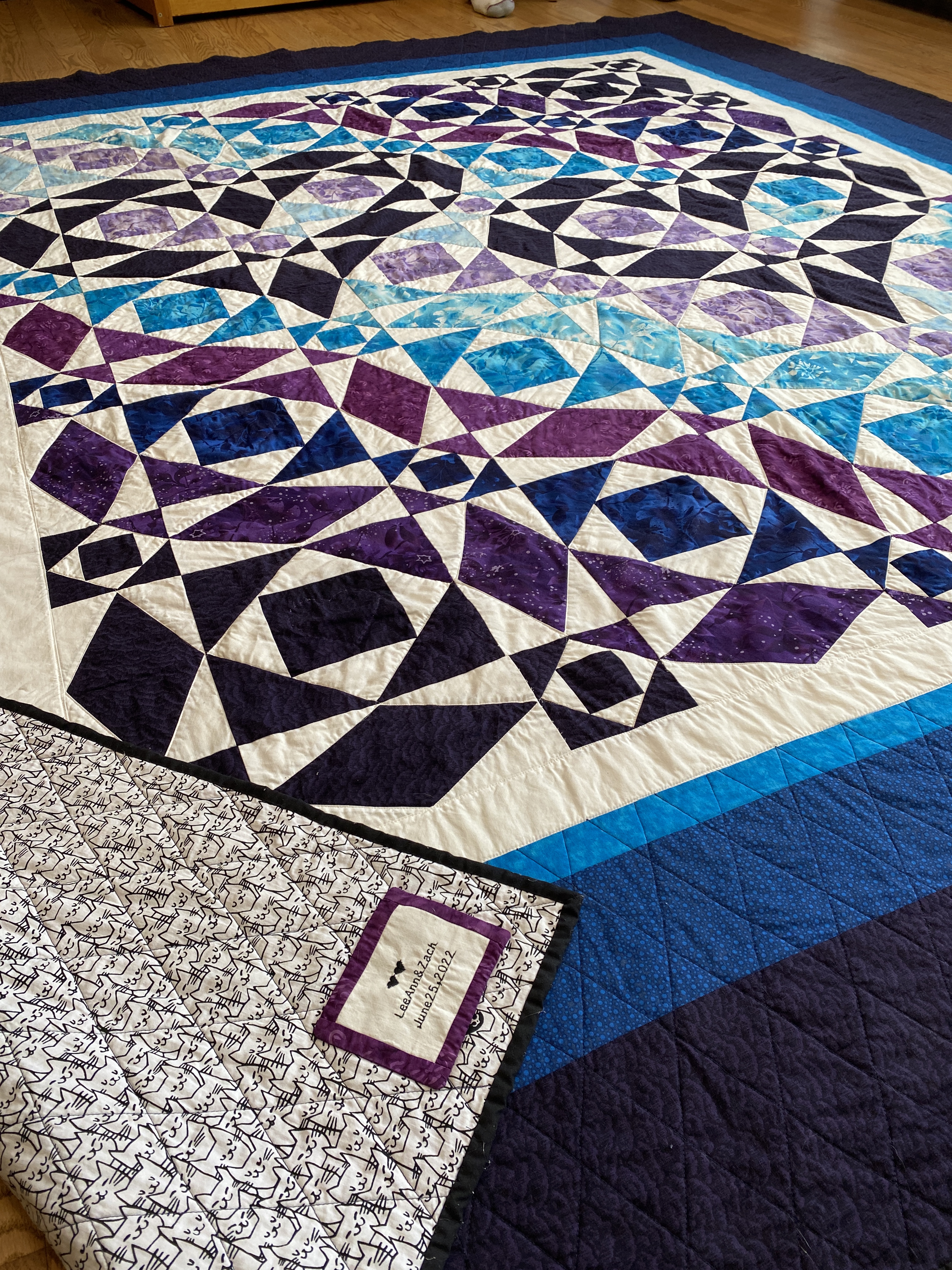 The next trip to California, a post-semester trip in May, was highly productive with us finishing the quilt top and adding the border, enough for it to fit a king size bed. As we added the border, we ditched the original gray fabric I had bought, instead opting for white fabric which matched the overall design much better.