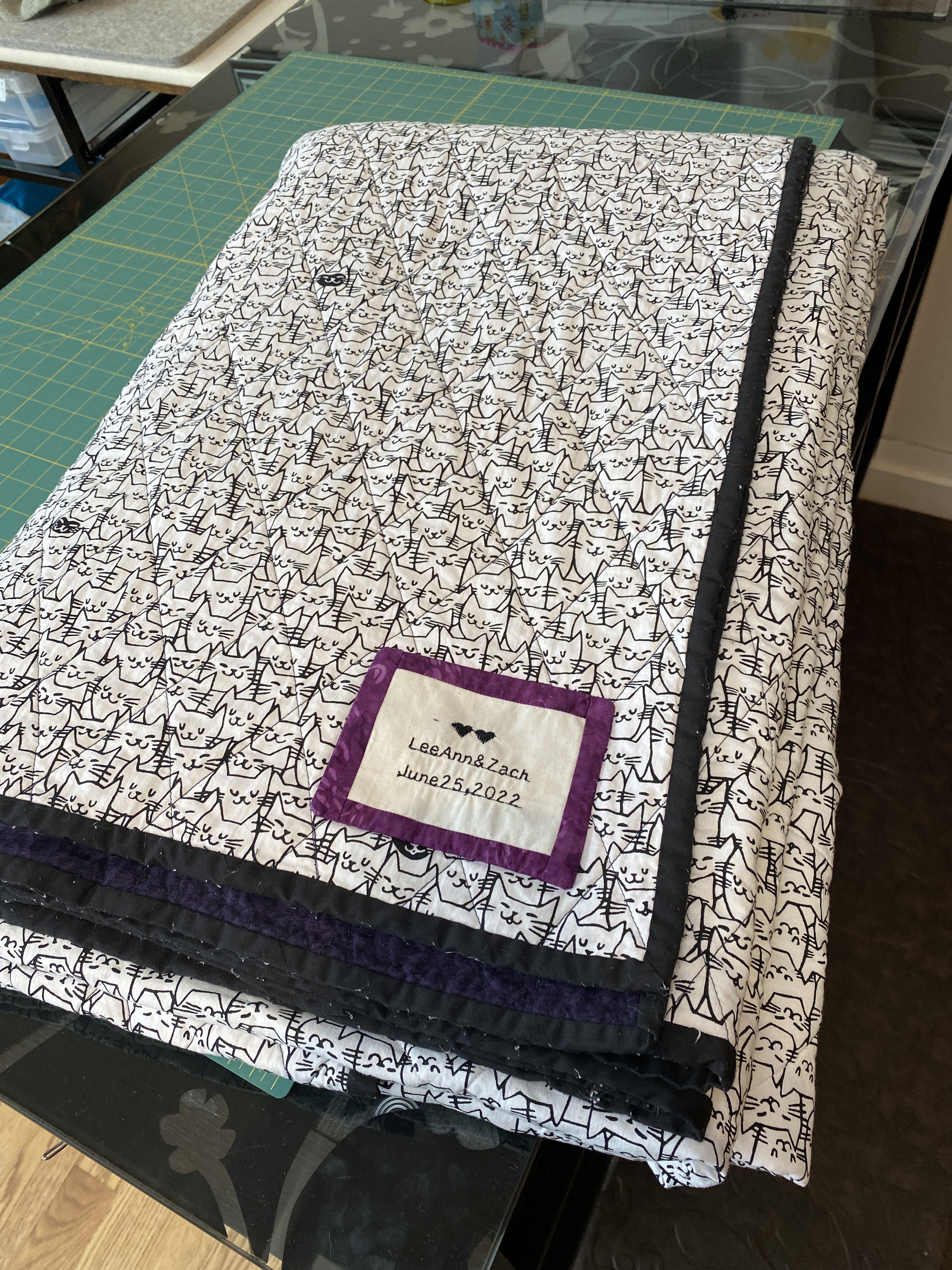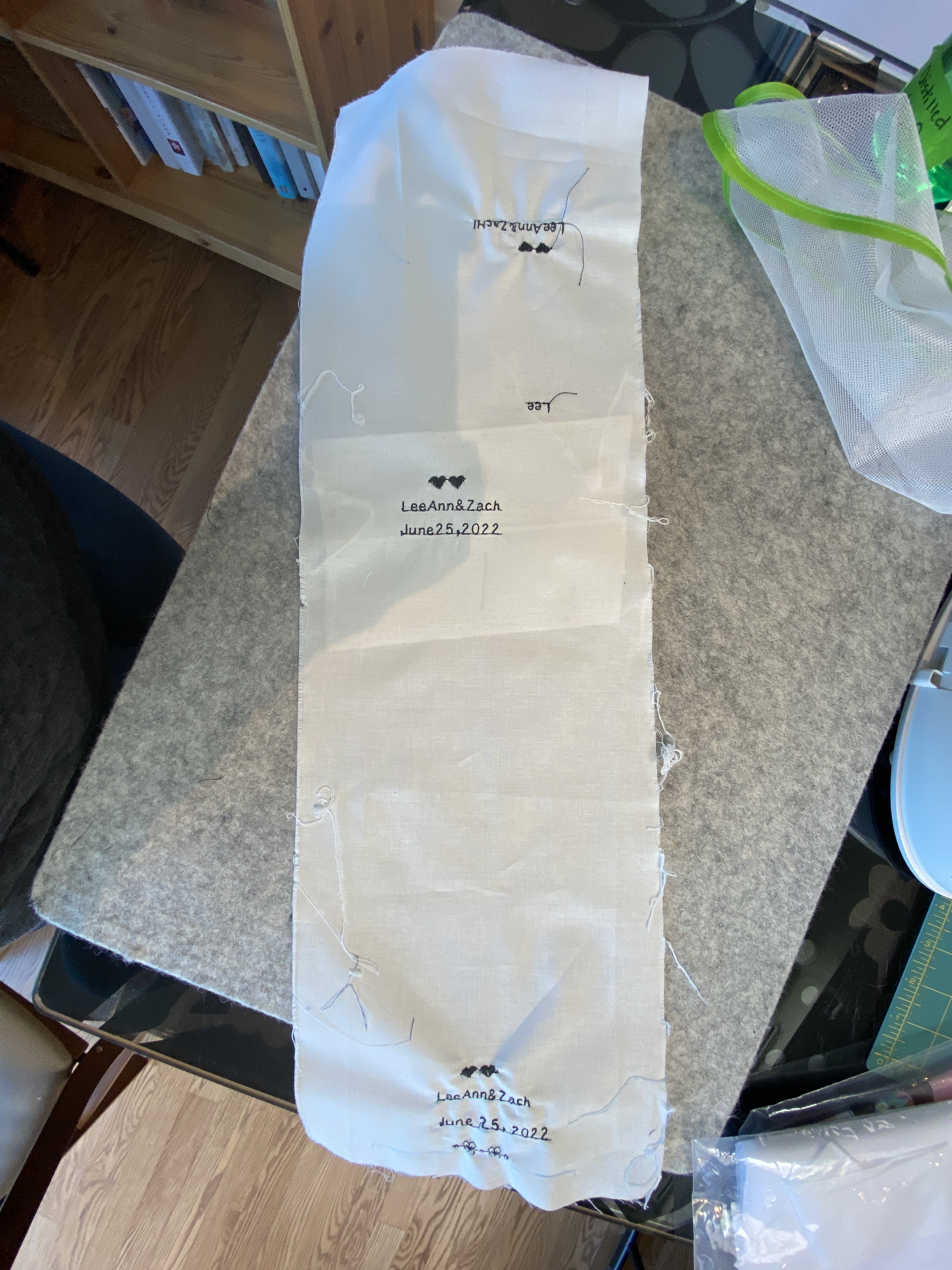 This felt like a much more fun way to spend my last day and to take a break from the main quilt project, so I took some extra fabric and started playing with the embroidery settings, measure out distances to get the center correct and finally created and attached the label for the quilt.