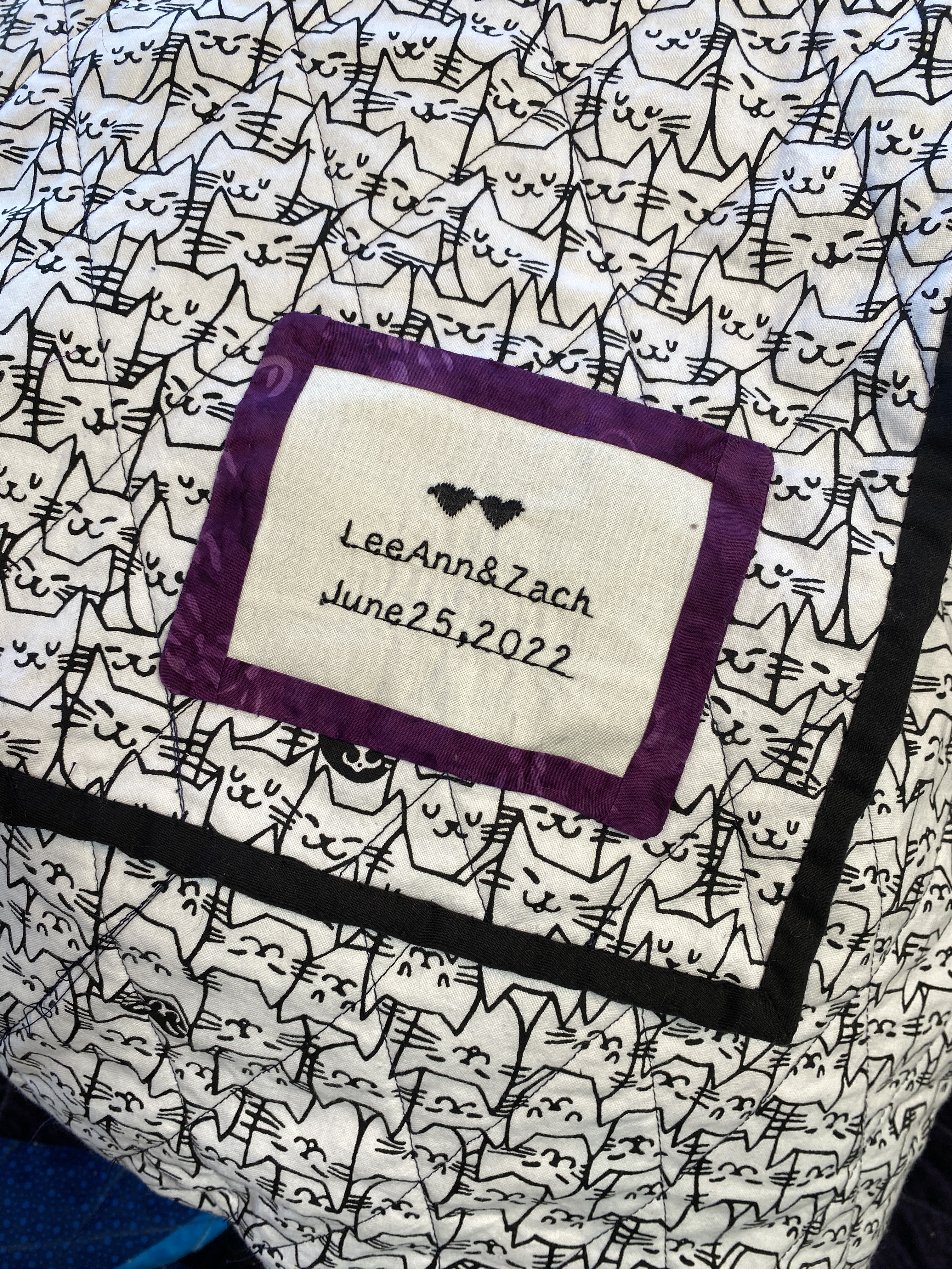 With the center and the borders completed, I jumped ahead and insisted we put the binding on. Hours at the sewing machine had left me feeling like hand sewing might be a nice change of pace so my mom and I started at different corners and raced each other to put on the binding. Obviously she won. With all of this completed and still one day left in my Thanksgiving vacation, I wasn’t ready to tackle the final bit of hand quilting that would be needed, nor was I in the headspace to re-examine all of the quilting done so far and find our mistakes and re-do those areas. Instead, my mom suggested I play with the embroidery settings on her machine and create the quilt label.