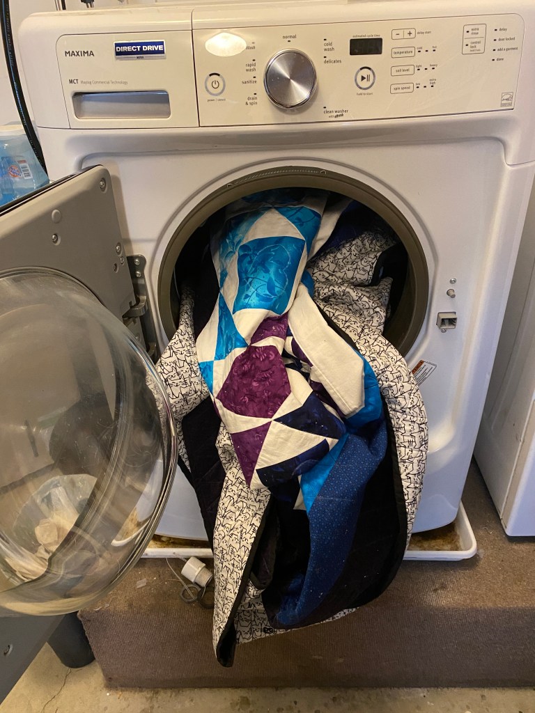 Washing the quilt turned into its own production as we decided to air dry it to ensure there was no shrinkage. Air drying it, of course, did nothing for taking off the little bits of cotton and fuzzies all over the quilt and the delicate wash left it with some chalk still on it. After leaving it draped across various apparatuses in the laundry room for twenty four hours, we went after it with damp washcloths and lint rollers and finally declared the quilt finished.