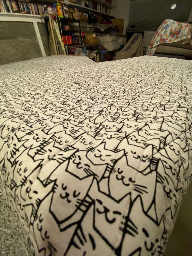 Feeling successful, the quilt was once again folded up and stored away, awaiting my next quick trip to California.
